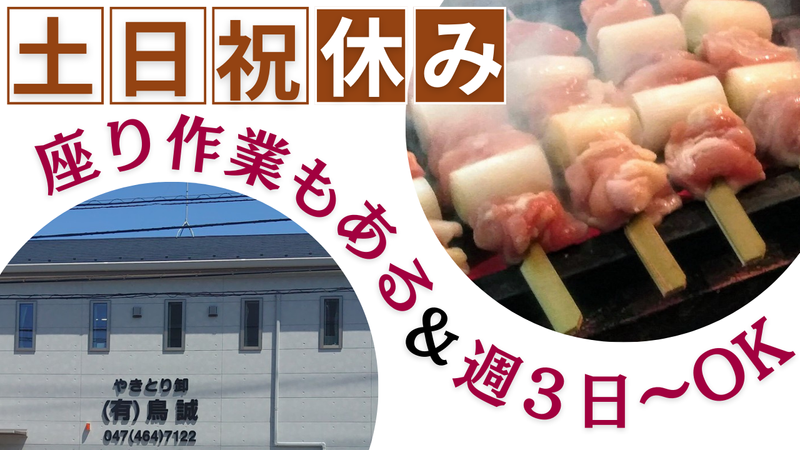 職種/仕事内容 | 仕事内容 令和元年OPENの綺麗な工場☆* 嬉しい土日祝休み♪週3~5日で応相談‼ 扶養内勤務なども相談可能です!! お仕事内容はとっても簡単♪  ̄V ̄ ̄ ̄ ̄ ̄ ̄ ̄ ̄ ̄ ̄ ̄ ̄ ̄ 焼鳥の串さしなどのお仕事! 食品製造未経験の方でも 安心のシンプル作業ですよ♬ 工場での仕事は 立ちっぱなしで辛いのでは… と思われる方もいるかもしれませんが 座り作業もあるので体に無理なく働けます✨ コツコツ仕事をするのが好きな方、 未経験からスタートしたい方など みなさん大歓迎です٩(ˊωˋ*)و✧*。 主婦(夫)さん中心に活躍中✿  ̄V ̄ ̄ ̄ ̄ ̄ ̄ ̄ ̄ ̄ ̄ ̄ ̄ ̄ 20代~60代まで幅広い年代の男女活躍中! 子育てが一段落して久しぶりの職場復帰や 子どもの学校行事と両立しながら勤務など 無理なく働ける環境です♬ 基本は平日週5日勤務になりますが、 お子さんの急な体調不良の際は お休みできますのでご安心を!! 復職したいけど扶養内希望で… という方もまずはご連絡ください♪ 人気の土日祝休みです♬  ̄V ̄ ̄ ̄ ̄ ̄ ̄ ̄ ̄ ̄ ̄ 従業員さんのプライベート充実の為、 土曜日もお休みにしました✨ 働きやすさを重視した職場だからこそ 若手から主婦さんまで 幅広く活躍しています!! 工場もOPENしてからまだ6年目! キレイな環境で快適にお仕事できるのも 定着率に繋がる1つです♬ 更衣室もキレイで使いやすいと スタッフさんから好評です*´∀`) |