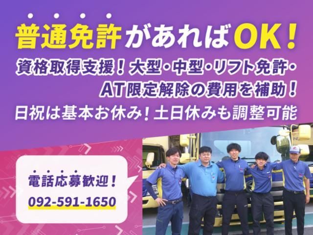 対象となる方 | 資格 ・普通免許(AT限定可)があればOK ・学歴・職歴・経験不問 ・未経験OK・異業種からの転職も歓迎 【こんな方におすすめ】 ・地元九州で地域を支える仕事がしたい方 ・安定した環境で成長を実感したい方 ・仲間とのチームワークを大切にしたい方 【社員紹介で入社した人も多数】 「うちの会社、働きやすいよ」と社員が自信をもって勧める職場です。 その言葉をきっかけに仲間が増えており、温かい人間関係が当社の魅力。 面倒見の良い先輩が多く、未経験でも自然に馴染める環境が整っています。 |