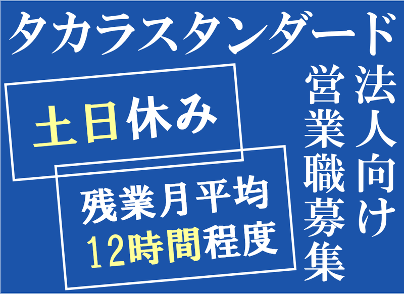 職種/仕事内容 | 仕事内容 \東証プライム上場の安定基盤/ 『タカラスタンダード』で 安心・安定のキャリア形成を! 【オススメPOINT】 ✅残業は月平均12時間程度 ✅土日祝休みの完全週休2日制、 年間休日はたっぷり120日以上! ✅賞与(年2回/7月・12月)4.6ヶ月分支給 ✅業界未経験でも安心!研修制度あり! ||◤募集職種について  ̄ ̄ ̄ ̄ ̄ ̄ ̄ ̄ ̄ ̄ ̄ ̄ ̄ ̄ ̄ ̄ ̄ ̄ ̄ ̄ あなたにお任せするのは、 ハウスメーカーや宅地開発業者様に対し 当社の住宅設備機器を提案する 法人向けルート営業です。 お客様のニーズを深く理解し、 世界最高水準のホーロー技術を駆使した 最適な製品をご提案することで、 快適で質の高い住空間づくりを サポートすることがミッションです。 当社は創業以来、高品質な製品づくりと お客様の満足を追求してきました。 営業職としてお客様と当社の製品を繋ぐ 重要な役割を担っていただきます。 <具体的には> ■住宅メーカーや有力宅地開発業者への 戸建住宅向けの商品 (システムキッチン・システムバス・ 洗面化粧台・トイレ等の住宅設備機器や ホーロー建材等)の提案営業 ■お客様のニーズをしっかりとヒアリングし 最適な住宅設備をご提案 ■より快適な住空間づくりのサポート 東証プライム上場企業としての安定基盤。 業界トップクラスの、確かな製品力。 社員が輝ける、働きやすい環境。 そのすべてがここにはあります! 人々の暮らしを豊かにする仕事で、 あなたの営業経験をぜひ活かしてください。 <勤務地アクセスについて> 「南堀端駅」「西堀端駅」「本町一丁目駅」 「松山市駅」から徒歩圏内で複数駅から アクセス可能です。 「JR松山駅」からも通勤可能! 車通勤可能!松山市内、松山市松前町、 東温市、伊予市などからも通勤可能です。 *転勤の可能性あり* 岡山・中国地方等 希望によっては全国も可能です ||◤入社後のサポート体制  ̄ ̄ ̄ ̄ ̄ ̄ ̄ ̄ ̄ ̄ ̄ ̄ ̄ ̄ ̄ ̄ ̄ ̄ ̄ ̄ 入社後3か月間は研修や先輩社員との 同行などを通して商品知識や営業方法 についてOJT型でしっかりサポート! その後も個人の状況に応じた きめ細かなフォローアップを行いますので、 業界未経験でも安心してスタートできます◎ ||◤この仕事のやりがい  ̄ ̄ ̄ ̄ ̄ ̄ ̄ ̄ ̄ ̄ ̄ ̄ ̄ ̄ ̄ ̄ ̄ ̄ ̄ ̄ ☆住宅設備という生活に密着した製品を 扱うことで、人々の暮らしを豊かにする 仕事に携われます! ☆営業としてのスキルアップはもちろん、 住宅設備の専門知識も身につきます! ☆お客様の喜びを直接感じられる、 やりがいのある仕事です! 何より大切なのはお客様と信頼関係を 丁寧に積み重ねていくこと。 お客様のお困り事や 建築予定の住宅についての状況を 教えていただきながら当社の製品を ご提案しています。 1社1社のお客様にじっくり向き合う ことができるのもやりがいの一つです。 私たちと一緒に、人々の暮らしを豊かにする 住宅設備の提案営業に挑戦してみませんか? あなたの営業経験を活かし、 新たなフィールドで活躍するチャンスです! ||◤当社、タカラスタンダードについて  ̄ ̄ ̄ ̄ ̄ ̄ ̄ ̄ ̄ ̄ ̄ ̄ ̄ ̄ ̄ ̄ ̄ ̄ ̄ ̄ 私たちは1912年の創業以来、 ホーローの可能性を追求し続けてきました。 長年の研究で培った独自の 高品位ホーロー技術を活かし、 住宅設備機器をお届けしています。 水まわりから住まい全体の 快適さを考える総合メーカーとして、 世界最高水準のホーロー技術を基に、 新しい暮らしを提案しています。 |