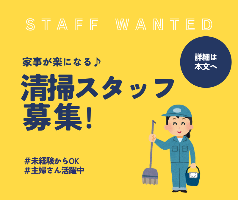 職種/仕事内容 | 仕事内容 ✨主な仕事内容✨ ✅校舎内の清掃(拭き掃き) ✅事務所・教室・黒板・階段・ トイレ・廊下などからのごみ収集 作業は2名で分担し、進めていきます。 担当場所はローテーション制で公平に 割り振りを行い、1人で担当場所を 清掃していきます。 経験不問◎頼れる先輩スタッフが しっかりサポートしますので ご安心くださいね。 ……………………………………………●○ ✨主婦さん活躍中の職場✨ 専業主婦だった方や 夫の定年退職後に仕事を始めた方等、 様々な主婦さんが働いています♪ ⭐ミドル世代活躍中!! ⭐シニア活躍中 ⏩活躍中の主婦さんにインタビュー♪①  ̄ ̄ ̄ ̄ ̄ ̄ ̄ ̄ ̄ ̄ ̄ ̄ ̄ ̄ ̄ ̄ ̄ ̄ ̄ 夫が定年退職して家にいるようになり、 「じゃあ今度は私が外で働く!」 と宣言してこの仕事を始めました!(笑) 自分で工夫してうまく仕事ができると すごく達成感があります◎ ⏩活躍中の主婦さんにインタビュー♪②  ̄ ̄ ̄ ̄ ̄ ̄ ̄ ̄ ̄ ̄ ̄ ̄ ̄ ̄ ̄ ̄ ̄ ̄ ̄ 人生の折り返し地点ではありますが 孫のプレゼント代の為に 頑張っています!(笑) 老眼が進んできている私でも、 しっかり汚れを発見して 綺麗にできています。 ⏩活躍中の主婦さんにインタビュー♪③  ̄ ̄ ̄ ̄ ̄ ̄ ̄ ̄ ̄ ̄ ̄ ̄ ̄ ̄ ̄ ̄ ̄ ̄ ̄ 元々専業主婦でした。 今はお仕事を始めて、前よりも 「生きている」実感が湧いています。 なかなか家では家事をしても 当たり前のことと捉えられがちですが、 職場では頼りにされますし、 仕事終わりに駅の近くを歩くと 沢山の人や電車、日々変わる風景から、 刺激がもらえるようになりました! ……………………………………………●○ |