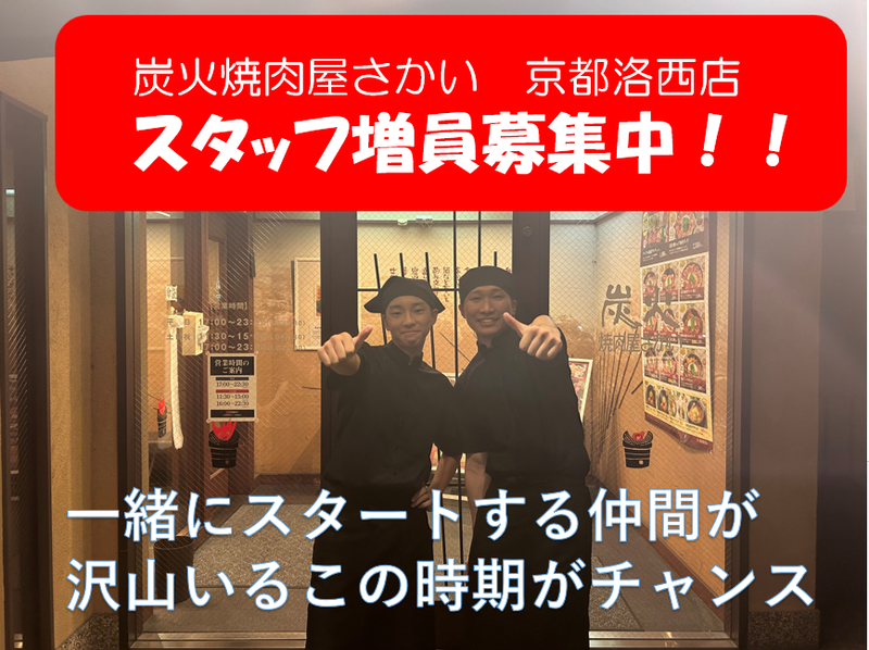職種/仕事内容 | 仕事内容 ━━━━━━━━━━━━━━━━ 炭火焼肉屋さかい 京都洛西店にて NEW店内スタッフ大募集(^^)/ ━━━━━━━━━━━━━━━━ / アルバイトデビューも 飲食店未経験の方も パートの社会復帰も大歓迎! \ ━━━【おすすめポイント】━━━━ *週1日~OK! *1日3時間の短時間もOK! *おいしいまかないあり! *稼働分前払い制度あり! *ラストの短時間だけでもOKだから 学校・サークルとも両立可能♪ ━━━━━━━━━━━━━━━━━ まずは「テーブルセット」や 「お客様のご案内」など かんたんなことからお任せ◎ 慣れてきたら、 「オーダー取り(注文伺い)」 「配膳(お料理提供)」 「お会計(レジ)」もお願いします♪ 手洗い・消毒を行い、 マスクを着用して勤務開始♪ お客様も大人数や宴会などの 接客はありません! ファミリーや友達同士の 少人数のお客様が多いです! 換気もしっかりおこなっているので、 感染症対策もバッチリです◎ -・-・-・-・-・-・-・-・-・-・- ★働き方はアナタ次第★ 「終電までや22時まで働きたい」 「ラストまでの3時間だけ働きたい」 「レギュラーでがっつり稼ぎたい」 「Wワークで他のバイトの後に働きたい」 「会社帰りや週末だけWワークしたい」 など何でも相談くださいね♪ -・-・-・-・-・-・-・-・-・-・- |