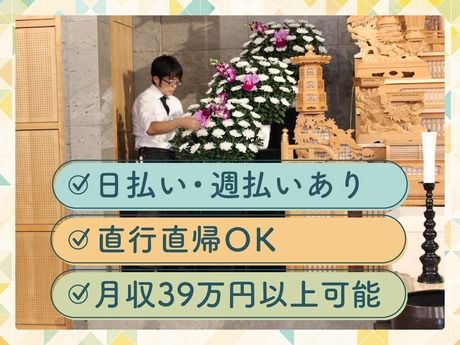 職種/仕事内容 | 仕事内容 ◇◆一生に一度、人生のラストイベントのお手伝い◆◇ 大切なセレモニーをサポートするお仕事。ご遺族に寄り添いながら、最後の時間を穏やかに支えましょう。 【具体的には】 ・お葬式会場の準備および片付け ・お葬式での進行のサポート ・お葬式の道具の運搬 など ▼以下のようなお仕事に挑戦することも可能 ・花祭壇の飾りつけ、花の運搬・組立。 ・祭壇の飾りつけや参列者の受付、ご案内。 ・お風呂に入れたり、旅支度をしたり納棺のサポート。 ※勤務は黒無地のスーツ着用です。 ◇◆入口は好奇心でOK!◆◇ *20代、30代、40代の男女が300名以上在籍 *月に12日以上出勤できればシフト自由 *Wワーク(副業)もok 高収入でシフトの融通が利くため、YouTuberや声優、お笑い芸人等、様々な方が活躍中! 他にも、役者、太鼓奏者、イベント設営経験者等、未経験から始めたスタッフばかりです! \\初めての現場でも安心// 社内アプリで勤務先や一緒に働くスタッフの情報を事前にチェックすることが可能◎ 雰囲気をイメージしてから現場に入れるので、不安なくスタートできます! |