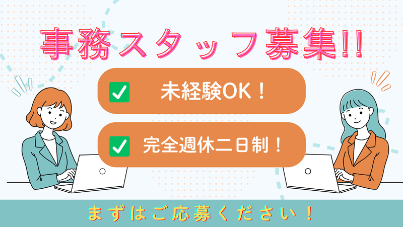 対象となる方 | 求める人材: 【✨求めている人材】 未経験大歓迎◎学歴不問! オフィスワークに挑戦したい方、お待ちしています! 【必須条件】 ◇ 高卒以上 ◇ 基本的なPC操作ができる方(メール、Word、Excel初級レベル) 【歓迎する条件】 ◇ 第二新卒の方 ◇ 主婦(夫)の方 ◇ 既卒の方 ◇ 事務職に興味がある方 ◇ 長期的に働きたい方 ◇ コミュニケーションを大切にできる方 【こんな方が向いています】 ◇ 明るく前向きに仕事に取り組める方 ◇ チームワークを大切にできる方 ◇ 細かい作業を丁寧にできる方 ◇ 新しいことを学ぶ意欲がある方 ◇ 20-30代の仲間と楽しく働きたい方 ◇ ワークライフバランスを大切にしたい方 |