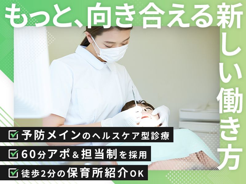 職種/仕事内容 | 仕事内容 お仕事のPOINT  ̄ ̄ ̄ ̄ ̄ ̄ ̄ ̄ ̄ ̄ ̄ ̄ ̄ ̄ ■ 60分アポ&担当制 ■ 予防メインのヘルスケア型診療 ■ 小児の口腔機能管理にも注力 ■ 院内研修充実 ■ 徒歩2分の保育所紹介可 ■ 20~30代活躍中 ______________ 【仕事内容】 ・スケーリングやSRP、 TBIなどの予防処置 ・定期メンテナンス ・口腔内写真や歯周検査、 唾液検査などの資料採得 ・カウンセリング業務 (生活習慣・口腔ケア・MFTなど) ・診療補助 ・滅菌や消毒などの院内業務 当院では60分アポイント×担当制の 診療体制を採用。患者様は40代~70代で メンテナンスで訪れる方が多いです。 患者様一人ひとりに向き合い、 マニュアル通りではない、 本当の意味での予防に注力しています。 【研修制度】 入職後1~2ヶ月間は先輩がマンツーマンで サポートします。チェックリストに沿って 動画教材による段階的な研修を実施。 ブランクがある方には基礎からの研修も ご用意しています。外部研修の参加支援も あるので、安心して成長できる環境です! |