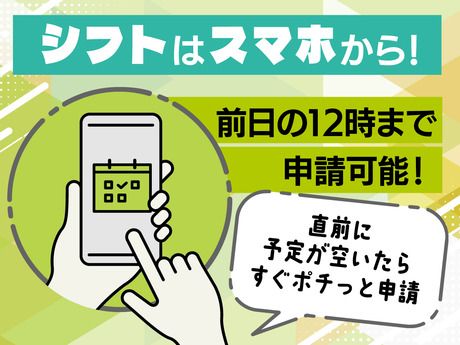 勤務時間 | シフト制 勤務時間 8:00~17:00 ◆【自由シフト】週1日~OK!働きたい日の前日12時迄に申請で◎ ◆【日払い制度あり】スマホ決済アプリで給与受取できる! ◆【未経験OK】2~5人のチーム制◎研修も充実! ◆【交通費支給】勤務地多数!直行直帰可で通勤ラクラク♪ ◆【AI面接実施中】スマホ1つで面接まで完結! |