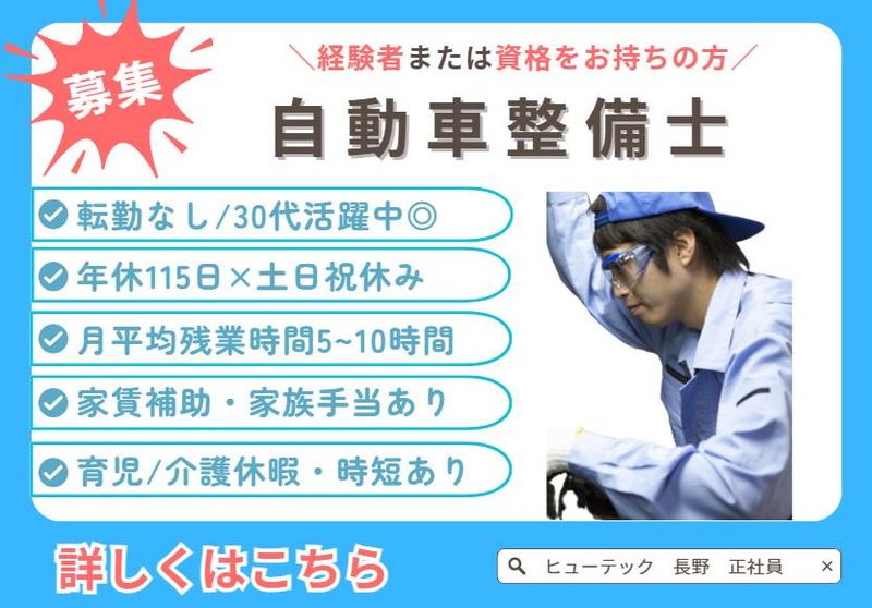 職種/仕事内容 | 仕事内容 ◤ ̄ ̄ ̄ ̄ ̄ ̄ ̄ ̄ ̄ ̄ ̄ ̄ ̄ ̄ ̄ ̄ ̄◥ ヒューテックのサービススタッフとして お客様のカーライフに「安心」を届ける 自動車整備士を募集! ◣_________________◢ ………⭐おすすめPOINT⭐……… ✅経験年数・保有資格に応じて処遇は 決定します!ご相談ください。 ✅30代活躍中! ✅年休115日×土日祝休み ✅残業ほぼ無し/月平均残業時間5~10時間 ✅ワークライフバランス◎ ✅家賃補助・寮社宅補助あり! ✅家族手当・育休・育児時短制度◎ ✅介護休暇・介護時短制度◎ ✅転勤なし◎地域に根差したお仕事 ✅資格取得支援制度あり ✅待遇・手当など充実 └詳細は“福利厚生”欄をcheck! ⭐仕事内容⭐  ̄ ̄ ̄ ̄ ̄ ̄ ̄ ̄ ̄ ̄ ̄ ̄ ̄ ̄ ̄ ̄ ̄ 株式会社ヒューテックの サービススタッフとして、 お客様のカーライフに安心を提供する、 自動車の整備業務全般をお任せします。 ⏩具体的には ……………………………………… ✅点検作業 └車検や定期点検など、自動車の安全確保と 環境保全のための点検を行います。 ブレーキ、ライト、サスペンションなどに 異常がないかを確認します。 ✅修理・交換作業 └点検結果に基づき、必要な修理や 部品交換を行います。 例:ブレーキパッド・フルードの交換、 冷却液の交換、エンジンや重要部品の 分解整備(※資格に応じて)など。 ✅部品交換作業 └オイル、タイヤ、消耗品などの 定期的な交換作業を行います。 ✅お客様対応 └不具合のある車の状況を顧客から 聞き取り、点検結果や修理の必要性、 費用などを分かりやすく説明します。 専門知識は不要です! ✅代理店部門の車両販売・リース・ 損保のサポート業務 ✨個人車両整備もありますが、リース 事業があるので、整備を頼まれるのは リース車が多い傾向です。 ╭━━━━━━━━━━━━━━━━╮ \✨長く働ける環境を整えています✨/ ╰━━━━v━━━━━━━━━━━╯ ☆ 努力や成長をしっかりと評価 └仕事や資格取得を頑張る意欲がUP! ☆ 個々のやり方や性格を尊重 └何事にも挑戦できる環境! ☆ 伸び伸びと仕事ができる職場 └様々な経験を積むことができます! |