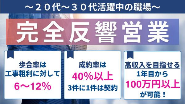 給与 | 完全歩合制 給与 完全歩合制 歩合率・・工事粗利に対して 6%~12% 商談単価により変動 2ヵ月ごと更新 ※商談の結果成約率がよくなれば、歩合率も付随してよくなります。 <月収例> 提携4カ月目:前職 不動産販売 商談数 30件 契約 10件 粗利600万×10%=60万円 提携12か月目:前職 太陽光営業 商談数 30件 契約 15件 粗利1,500万×10%=150万円 提携17カ月目:前職 美容師 商談数 35件 契約 20件 粗利1,800万×12%=216万円 ※研修3週間あり ※商談交通費は高速代も含めすべて本社が負担 【基本出社はございません。】 自分の力がお金にダイレクトにECODAに興味はありませんが? 最初集中して稼げば歩合率が上がるため、1年後には週3稼働で月収100万可能かも それ以上稼ぎたい方は週5でも可能です! 集客は本社が行います! |