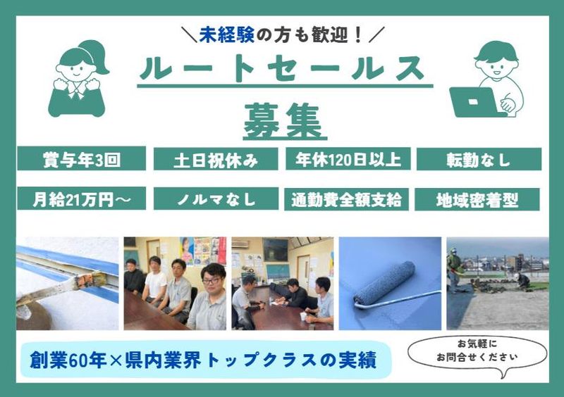 職種/仕事内容 | 仕事内容 当社は、長野県でトップクラスの実績を誇る 創業60年の防水工事専門会社です。 特に水回りの防水工事において、 県内屈指の技術力を有しています。 ┏・・・・・・・・・・・┓ ✨ この求人のポイント ✨ ┗・・・・・・・・・・・┛ ⏩ 未経験でも安心のサポート体制 ⏩ 創業60周年! 県内トップクラスの防水工事専門会社 ⏩ スーパーゼネコンや県・市からの 直接依頼も多数◎ ⏩ 事業競合も少ない安定業界 ⏩ 既存顧客の対応が中心! ⏩ 地域に根差した信頼関係◎ ⏩ コツコツと着実に信頼関係を構築したい 方にはピッタリです◎ ⏩ 土日祝休み(月1回土曜出社) ⏩ 賞与年3回(5.5ヶ月分) ⏩ 年間休日120日以上 ⭐仕事内容  ̄ ̄ ̄ ̄ ̄ ̄ ̄ ̄ ̄ ̄ ̄ ̄ ̄ ̄ ̄ ̄ ̄ ̄ ■今回の募集について …………………………… 社員の定着率が高い一方で、20代・30代の 人材不足が当社の課題となっています。 会社全体で若手へのウハウを継承し 次世代を担う人材を育てていくため、 今回は若手人材の募集を行うことに なりました。 <具体的な仕事内容> ✅ 建設業者(ゼネコン)からの見積もり および打ち合わせ ✅ 受注・現場の監理及び材料発注の指示 ✅ 安全協議会の出席など 既存のお客様対応が中心となります。 新規開拓はほとんどなく、地域密着型で エリア分けされた担当地域内で、 時間をかけてコツコツと信頼関係を 構築していただきます。 ⭐営業の流れ ………………… ・元請であるゼネコンから見積もり依頼 ・営業が図面を見て、見積もり作成 大手ゼネコンの場合は、専任の購買 担当者と金額折衝を行っていただきます ・受注が決まると、現場の確認 ・総務、経理に請求書の依頼 ・現場が完了したら、保証書の手続き 担当顧客から見積もり依頼がないときは こちらからアプローチをし、防水工事の 予定などの情報をキャッチアップします。 受注後の職人さんの手配などは工事管理の 担当者が行いますが、小規模の現場では、 営業が行うこともあります。 ◆1日の流れ(一例)◆ 8:00 出社 │ 9:00 担当エリアへ出発 │営業車で担当エリアの取引先へ │ 10:00~ 取引先訪問 │見積もり依頼の確認や進行中の │案件についての打ち合わせ │ 12:00~ 昼休憩 │ 13:00~ 現場確認 │受注が決まった現場や完了した │現場の確認 │ 15:00~ 社内業務 │見積書作成や報告書の作成 │ 17:00 退社 ⭐担当エリア ………………… 長野県内が中心ですが、まれに県外 (山梨・新潟)に行くこともあります。 ※宿泊を伴う出張はほとんどありません ※担当エリアを決めて、効率的に営業 しています ⭐入社後のイメージ  ̄ ̄ ̄ ̄ ̄ ̄ ̄ ̄ ̄ ̄ ̄ ̄ ̄ ̄ ̄ ̄ ̄ ̄ 1年目は工事現場の業務を覚え、 2年目以降で営業スタート! 先輩に同行し、お客様へのご挨拶や 見積もりの仕方を教わります。 最初は、小規模の取引先からお任せし、 慣れてきたら徐々に大手を引き継いでいく イメージです。 未経験からでもしっかりとした サポート体制で安心して成長していただける 環境を整えています。 ⭐やりがい  ̄ ̄ ̄ ̄ ̄ ̄ ̄ ̄ ̄ ̄ ̄ ̄ ̄ ̄ ̄ ̄ ̄ ̄ 材料は設計図に記載されているものを 使用するのですが、案件によっては、 同等品であれば変更も可能です。 そのようなとき、これまでの実績や経験を 踏まえて、営業が別のメーカーの材料を 提案することもあります。 提案が採用されたときは、大きなやりがいを 感じることができます! また、新築ではなく改修工事(リニューアル) の場合、「どんな材料がいいですか?」と 聞かれるため、現場に出向いて最適な材料を 提案します。お客様の課題解決に直接貢献 できる喜びがあります。 ⭐会社について  ̄ ̄ ̄ ̄ ̄ ̄ ̄ ̄ ̄ ̄ ̄ ̄ ̄ ̄ ̄ ̄ ̄ ̄ 当社は、長野県でトップクラスの実績を誇る 創業60年の防水工事専門会社です。 ⏩強みと技術力 特に水回りの防水工事において、 県内屈指の技術力を有しています。 ビル、橋、温泉施設など、 目に見えない部分で社会インフラを支える 重要な役割を担っています。 ⏩事業の安定性 防水工事は12~15年ごとの 定期的なメンテナンスが必要なため、 需要がなくなることのない 安定した業界です。 ⏩信頼と実績 誠実な仕事ぶりが評価され、 スーパーゼネコンや長野県・市町村から 多くの直接依頼をいただいています。 |