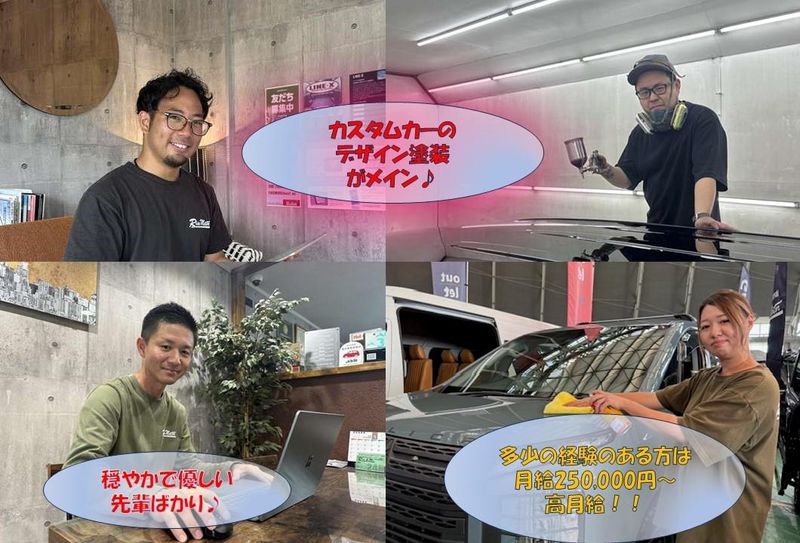 職種/仕事内容 | 仕事内容 \\求人のPOINT// ✅年間休日120日程度 ✅多少の経験がある方は月給25万円以上 ✅平均年齢31歳の若い職場 ✅未経験から活躍できる環境! ✅車好きな方大歓迎! ✅自分の作品がお客様の手に 渡る喜びを感じられる ━━━━━━━━━━━━━━━━━━━ ⭐仕事について ━━━V━━━━━━━━━━━━━━━ 在庫車両のオールペイントや カスタムペイント、パーツの取り付け等の カスタム業務をお任せします。 板金作業より、塗装作業やカスタムの 割合が多いのが特徴です。 未経験の方は、先輩スタッフの業務補助から 始めていただきます! <具体的な仕事内容> ✅車両の全塗装(オールペイント) ✅カスタムペイント(デザイン塗装) ✅パーツの取り付け作業 ✅車両の磨き作業 ✅部品の脱着作業 └未経験の方は最初から これらすべてをお願いする わけではありません。 洗車や磨き作業の補助など 基本的な作業からスタート していただきます。 ━━━━━━━━━━━━━━━━━━━ ⭐ここが魅力! ━━━V━━━━━━━━━━━━━━━ ✨一般的な板金塗装店では 事故車の修理が中心ですが、 当社では商品車両を塗装して 販売するため、自分が手掛けた 作品がお客様の手に渡る喜びを 感じることができます! ✨レトロ風な仕様変更や特殊な デザイン塗装など創造性を 活かした作業も行えます! ✨現在活躍している27歳の スタッフも未経験からスタート し、今では一人前の技術を 身につけています。 ✨トラックの塗装なども 手掛けており、将来的にも 需要が見込める業界です。 ━━━━━━━━━━━━━━━━━━━ ⭐職場環境・従業員構成 ━━━V━━━━━━━━━━━━━━━ ✅塗装部門は現在2名体制 ✅平均年齢31歳と若いスタッフ中心 ✅メリハリのある職場でオンオフが しっかりしています ✅職人気質のイメージがある業界ですが、 当社のスタッフは皆優しく、 厳しすぎる環境ではありません ✅頑張り次第で社用車支給も! ━━━━━━━━━━━━━━━━━━━ ⭐当社について ━━━V━━━━━━━━━━━━━━━ 私たちライズモーターは、 専門的な車種を取り扱う カスタムカー専門店です。 在庫車両のオールペイントや カスタムペイント、パーツの取り付け等、 カスタム業務を中心に行っています。 当社では現在、塗装部門を強化するため、 新たな仲間を募集しています。 車好きな方にとって、 自分の技術で車の価値を高める この仕事は、大きな魅力があります。 ぜひ私たちと一緒に、 カスタムカーの世界で 新しい挑戦をしてみませんか? |