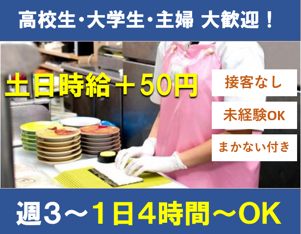 職種/仕事内容 | 仕事内容 回転ずしなごやか亭にて ランチタイムの キッチン業務をお願いします。 ⭐業務はポジションごとの分担制! ⭐下記のお仕事から色々な業務を経験し 自分に合った仕事を見つけましょう! 【お仕事内容】 ◆軍艦にネタを乗せたり、デザートの作成 ◆巻物の作成 ◆洗い物 調理は易しい調理(レシピあり)です。 【働くメリット】 ✅1.高時給でガッツリ稼げる! ・時給1180円~! ・土日は時給+50円! ・できることが増えれば更に昇給も! ✅2.働きやすさ抜群 ・週3日~1日4時間~OK ・シフトの融通も抜群! →授業終わり~、お昼の隙間時間などあなたの希望を教えて下さい! ・WワークOK! ✅3.未経験・ブランクのある方も安心! ・マニュアル完備 ・はじめは先輩がついて丁寧に指導! ほとんどの方が未経験スタート☆ 安心して働けるバイトです! ✅4.その他のメリット ・30種類のおいしい賄いあり!(毎日) ・仲の良さには自信あり! ・高校生/大学生~主婦さんまで 幅広い方が活躍中! ここまで読んで頂き、ありがとうございます! あなたのご応募をお待ちしております! |