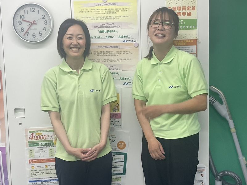 職場環境・雰囲気 | 【Point オススメポイント】 保育所の子供を預けながらヘルパーをして15年が経ち、上の子は大学生になりました! 最初は不安ばかりの慣れない介護のサービスに戸惑いましたが、今では訪問し、ご利用者様の笑顔に会えることが楽しみな自分がいます。 ニチイケアセンター上本町で一緒に働きませんか? 小人数ですが明るく楽しい職場です。 お気軽にお問合せ下さい ご希望の面接枠がない場合はご相談ください。土日でも可能な限り調整します。 【Message 採用担当者より】 【介護未経験の若者から、子育て中の主夫・主婦パート、中高年、シニア世代まで、幅広く活躍できます!】 ニチイでホームヘルパー2級、初任者研修、介護福祉士などの資格を活かして 人の為、社会のために役立つ介護職をしませんか? あなたの力を貸してください!お待ちしております!! ニチイの特長ご紹介します。 [1]全国に活躍の場があります! ニチイには全国に介護拠点があります。だから今お住まいの近くでのお仕事探しはもちろん、引越先でも介護士・介護スタッフとしてニチイで働く方が大勢います。 [2]フルタイムはもちろん、短時間シフトでの勤務などさまざまな働き方が選べます ご家庭の都合に合わせた働き方ができます。様々なシフトバリエーションがあり、週1回、または短時間でも働けるサービスもありますのでご相談ください。 ハローワークの紹介状をお持ちの方は、面接時にご持参ください。 |