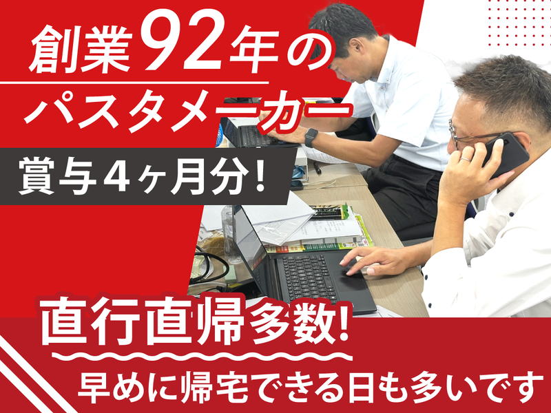 職種/仕事内容 | 仕事内容 \未経験からの営業デビュー応援✨/ 「挑戦したい」その気持ちだけでOK! 食の未来をつくる営業にチャレンジしよう! ✅学歴一切不問!必要なのは普通免許だけ ✅業界未経験から始めた人9割以上! ✅ノルマなしの営業スタイル ✅直行直帰が多く、残業も少なめ♬ ✅創業92年の安定した基盤 ✅自社製品の社員割引あり! ・・・・・・・・・・・・・・・・・・・・・・・・・・・・・・・・・・・・・・ ╭━━━━━━━━━━━╮ 営業デビューを応援!✨ ╰━v━━━━━━━━━╯ 「フリーターから正社員になりたい」 「営業って難しそう…」 「そもそも未経験からできるの?」 ――そんな不安を持つ方も大丈夫! 当社では営業未経験から スタートした社員が9割以上! 最初は先輩が横について、 商品知識やお客様との会話の流れを 丁寧にサポートします。 ・・・・・・・・・・・・・・・・・・・・・・・・・・・・・・・・・・・・・・ 【仕事内容】 ■ルート営業 既存のお客様(外食チェーン・卸売店など) を訪問し、新商品のご紹介やフォロー。 ■新規営業 飲食店・カフェなどへ商品をご案内。 まずは「お話を聞いてもらうこと」から! ✅ ノルマなし ✅ 直行直帰OK ✅ 分からないことはすぐに オフィスで相談できる体制 お客様と“信頼関係”を築くことが、 営業の一番大切な仕事です。 ・・・・・・・・・・・・・・・・・・・・・・・・・・・・・・・・・・・・・・ 【入社後の流れ】 ①まずは先輩に同行してお客様訪問 ②商品知識・会話のコツを少しずつ習得 ③慣れてきたら既存のお客様を引き継ぎ ④ゆくゆくは新規営業にも挑戦! 成長スピードに合わせて進めるので、 空白期間があっても安心です。 ・・・・・・・・・・・・・・・・・・・・・・・・・・・・・・・・・・・・・・ 【会社について】 1933年の創業から92年の歴史を持つ 老舗パスタメーカー。 自社工場で製造し、全国の飲食店や 直営レストランに商品を届けています。 レストランのシェフからも 評価をいただいており、 自信を持って提案できる商品です。 |