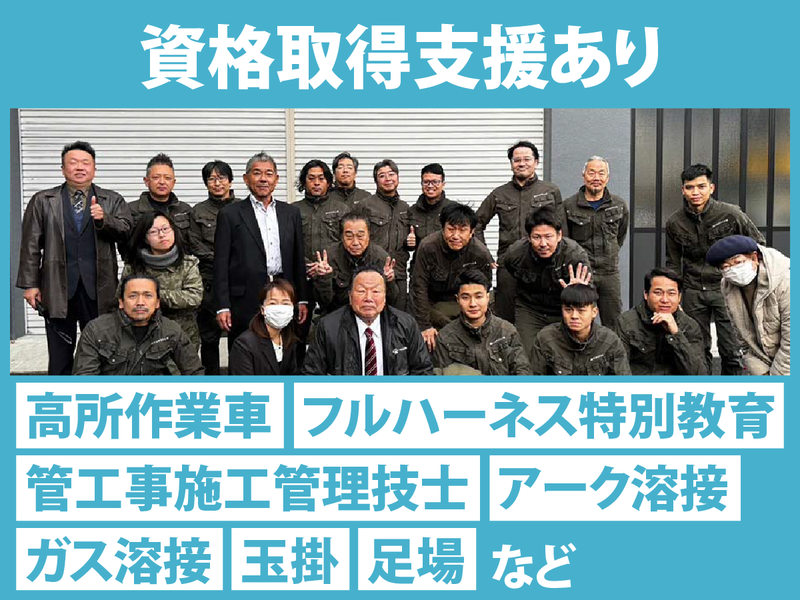 待遇・福利厚生 | 【保険制度】 雇用保険、労災保険、健康保険、厚生年金 【福利厚生】 待遇・福利厚生 【福利厚生】 ●昇給随時 ●賞与年3回 ●各種手当有 ・深夜手当 ・出張手当 ・休日出勤手当 ●退職金は中退共制度を利用 ※本採用から1年以上の勤務で支給有 ●車・バイク通勤OK ●社員旅行制度あり ●交通費規定内支給 ●資格取得支援 ・管工事施工管理技士 ・高所作業車 ・フルハーネス特別教育 ・アーク溶接 ・ガス溶接 ・玉掛 ・足場 など |