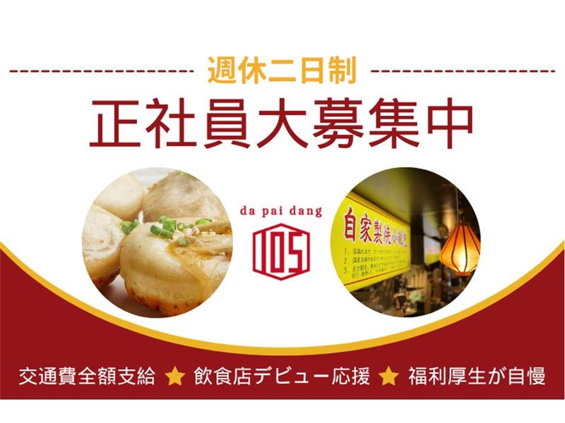 職種/仕事内容 | 仕事内容 ―――【全国300店舗以上展開】―――― 自己資本比率85%の大手安定企業 賞与年2回&食事・家族手当&引越し補助 30代で年収600万円の店長を目指せます 賞与年2回・交通費全額 ――――――――――――――――――― 【店舗について】 本場の点心師がレシピを開発。 専用の鍋で豪快に焼き上げた 焼小籠包が人気のダパイダン105。 お子さま向けメニューも開発。 ファミリーで楽しめる台湾料理 ダイニングレストランです。 【仕事内容】 具体的には ・お客様のご案内 ・オーダーの確認 ・ドリンクメイク、サーブ など。 接客の基本や仕入れ・在庫管理、 人材育成もイチから習得できます。 アイデアを形にするチャンスも多数! みんなが楽しく無理なく働ける。 そんな環境を作っていきましょう。 【裁量権が大きい】 弊社はサービスマニュアルなし! オリジナルメニューの考案や 集客・顧客満足度向上の提案を 前向きな姿勢の方をお待ちしています。 【働きやすさバッチリ】 アルバイトさんの急な欠勤等で、 呼び出されることはありません! 必ず月8日間休めます! さらに産前産後・育児休暇の 取得・復職実績もありますので 将来を考えても安心の職場です。 |