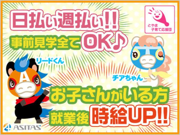 待遇・福利厚生 | 【保険制度】 雇用保険、労災保険、健康保険、厚生年金 【福利厚生】 待遇 ◇柔軟な給与支払い制度 急な出費があっても安心して働ける給与制度をご用意しています! ・日払い、週払い対応の前払い制度有 ・初日分から毎日でも利用可能(規定有) ・手数料は銀行振込の実費のみ ・現金手渡しにも対応 ◇子育て中の方を応援しています 「とやま子育て応援団」に協賛しています! ・お仕事が決まった方は時給プラス10円の特典有 ・お子様連れでの登録時にジュースをプレゼント ※18歳未満のお子様がいる方が対象 ◇充実した待遇と福利厚生 ・社会保険完備 ・交通費:往復分を別途支給(上限有) ・有給休暇制度有 ・産前産後休業、育児休業の取得実績有 |
