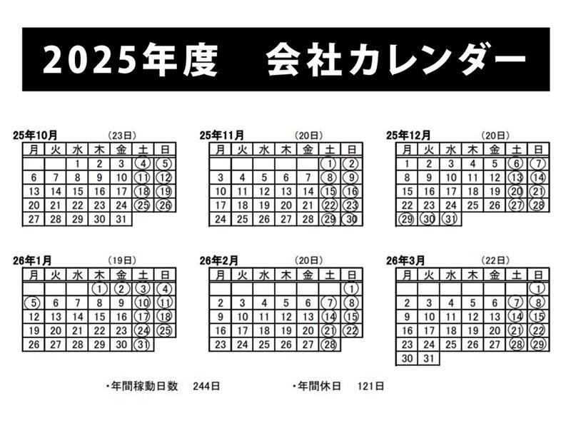 休日休暇 | 休日休暇 完全週休2日制(土日) <休暇制度> 年間休暇日数121日 GW休暇 夏季休暇 冬期休暇 産前産後休暇 育児休暇 介護休暇 有給休暇(法令) 長期就労の方を中心に 年間14日以上の有給取得を 社内ルールにしており、 月1日以上の有給取得ができています。 当社の年間カレンダーは 画像写真の箇所にありますので、 こちらを参照ください。 |