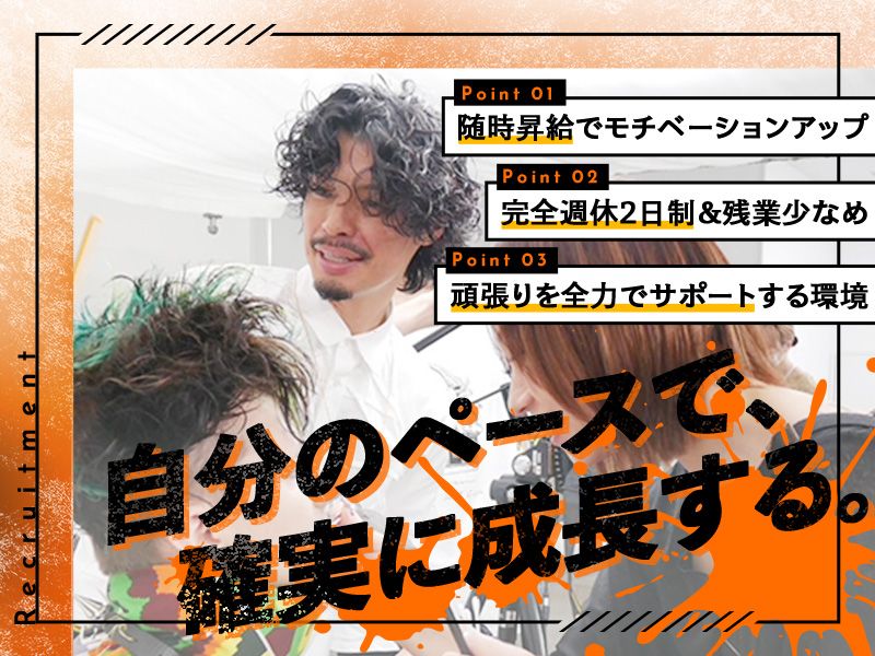 職種/仕事内容 | 仕事内容 ~*~*~*~*~*~*~*~*~*~*~*~ 「もっと成長したい」その想いに、 チャンスと仲間が応える環境! ~*~*~*~*~*~*~*~*~*~*~*~ <<押さえておきたいポイント>> ✅完全週休2日制&残業少なめ! ✅先輩スタッフのレッスンあり! ✅働きやすい職場環境が魅力! 【 仕事内容 】 スタイリストとして 以下の美容業務をお任せします。 <具体的な内容> ・ヘアカット ・カラー ・パーマ ・トリートメント/シャンプー、ブロー ・ヘアセット ・カウンセリング ・接客 ・レジ/受付/予約管理 ・SNS更新、サロン運営業務 など \スキルアップをサポート!/ 先輩によるレッスンがあります! また、資格取得支援ありで 成長を全力でサポート! ※アカデミー制度あり ※海外研修(パリ・ロンドン・NY)も実施 |