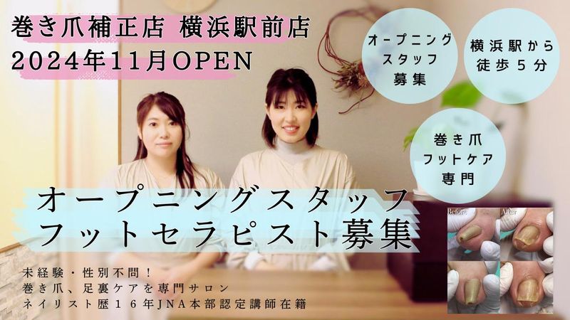 職種/仕事内容 | 仕事内容 =================== 全国50店舗以上展開! “足元から人生を変える”巻き爪補正・フットケア専門サロン。 2024年11月、横浜駅前に新規OPEN! JNA本部認定講師が在籍するサロンで 未経験から“プロの技術者”へ。 =================== 【求人のPOINT 】 ✅ 経験ゼロからOK!手に職がつく研修制度有 ✅ 月給24万円以上+各種インセンで安定収入 ✅ 残業ほぼなし&シフト制でプライベート確保 ✅ 駅チカ!横浜駅徒歩5分の好立地 ✅ 店長候補も歓迎!キャリアアップも目指せる スタッフのほとんどが未経験スタート。 平均年齢は20代後半と若手中心の職場です。 美容と医療の間を支える「巻き爪補正」の専門技術を身につけて、 “誰かの悩みを解決する手”になりませんか? 【お任せする仕事内容✨】 ・巻き爪/陥入爪/変形爪などの補正施術 ・タコ・ウオノメ・角質などのフットケア施術 ・接客・受付対応 ・事務作業・SNS更新 など ★お客様の悩みにしっかり向き合える、提案型ではない“結果重視”のサロンです ★8日間の集中研修あり!基礎からしっかり学べます -【1日の業務イメージ(例)✨】- 09:30 出社・サロン準備 ↓ 10:00 午前のお客様施術スタート ↓ 12:00 お昼休憩 ↓ 14:00 SNS投稿や予約管理などの空き時間 ↓ 17:00 夕方のお客様施術 ↓ 19:30 終業・退勤 【スタッフの声✨】 「流行に左右されない技術で安心して働けます」 「お客様からの“ありがとう”が何よりのやりがいです」 「研修がしっかりしていて、未経験でも不安がなかった」 「横浜駅から近くて通いやすいのが嬉しい」 【店舗紹介】 \ 巻き爪補正専門店 横浜駅前店 |関内店|鎌倉大船店/ ・オープニングスタッフ ・JNA本部認定講師/椛島舞子が直接指導 ・SNSフォロワー2.7万人!ネイル業界でも注目の技術者 |