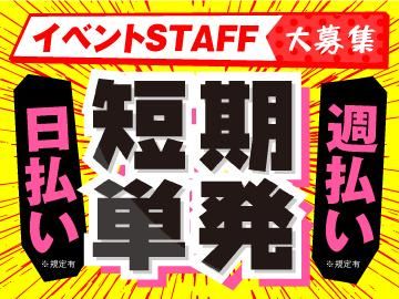 職種/仕事内容 | 仕事内容 <即勤務OK!> ・単発&短期OK!気軽に勤務スタート ・給与は日払い・週払い(規定)に対応! ・友達同士での思い出づくりも大歓迎! 年間2万件以上のイベントや展示会の 施工や設営・運営を請け負っている私たち。 イベント運営スタッフとして現場を 一緒に支えてくれる方を大募集します! - 具体的なお仕事 - ・来場者の案内や誘導 ・チケットもぎり、パンフレット配布 など 円滑なイベント運営をサポートします。 大人気アーティストのライブや 有名グルメの展示会など、 色々な種類のイベントを担当できるので みんな楽しみながら働いています! - シフトは自由自在! - 「短期」「単発の」「長期」 「長期休暇中の期間限定」etc. 自分の都合に合わせて働くことが可能! スキマ時間を有効活用できます。 「友達が働いているから」 「働きたいときにだけ働けるから」 という理由で応募された方も多数! 少しでも興味があればご応募ください! - スタッフの声 - イベントが大好きで よく自分でも客として足を運んでいます。 そんなイベントの裏側を見られるのって 楽しそう!と思って応募しました。 未経験でしたが、難しいことはないし 現場でしっかり指示を出してもらえるので 安心して働くことができています! 給与は日払い・週払い(規定)で すぐにもらうことができるので 金欠で困ったときにも助かっています! |