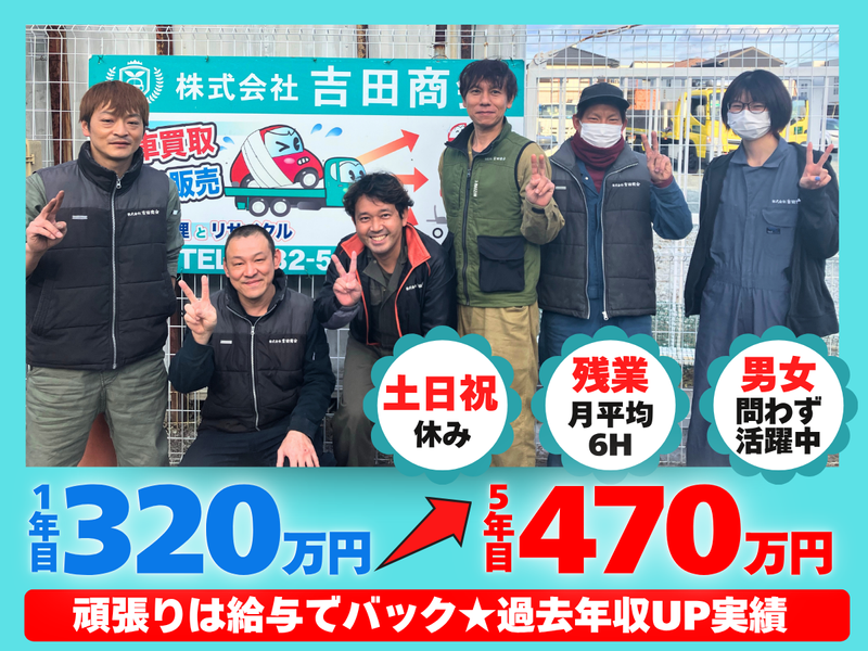 職種/仕事内容 | 仕事内容 ≪ 20代30代の男女活躍中 ≫ ⭐髪型・髪色自由 ⭐月平均残業6時間! ⭐基本土日祝休み&長期休暇あり ✨ライフワークバランス◎  ̄V ̄ ̄ ̄ ̄ ̄ ̄ ̄ ̄ ̄ ̄ ̄ ✅残業ほぼナシ!サッと帰宅 …家でのんびり過ごせるので プライベートの時間も確保! ✅有給消化率高め◎ …みんな気兼ねなく取得してるので 「申請しづらい」なんてこともなし! ✅年間休日115日でお休みしっかり …前年度から年間休日が10日増! 社員みんなの希望を叶えるため 日々取り組んでいます! ✨コツコツ着実に収入UPも可能  ̄V ̄ ̄ ̄ ̄ ̄ ̄ ̄ ̄ ̄ ̄ ̄ ̄ ̄ ̄ ✅会社負担で資格取得をバックアップ …取得した資格はしっかり手当で支給 ✅頑張りはしっかりと評価する社風! …昨年度は基本給1万~1万5000円UP! 初任給は少なめ…かもしれませんが 『基本給』が『随時昇給』していきます ので、安心してください♪ ―――――――――――――――――――― 【仕事内容】 今回募集するのは、古くなった車や廃車を 分解し、使えるパーツを取り外すお仕事。 ▼主な作業内容 【車の分解作業】 …ドアやエンジン等のパーツ取り外し 【パーツの分別】 …再利用可能なものを仕分け 【圧縮機でプレス】 …再利用が難しいパーツを サイコロ状にギュッとまとめる ◎作業内容自体はどれもシンプルです。 ✨ココがポイント!  ̄V ̄ ̄ ̄ ̄ ̄ ̄ ̄ ̄ 【適度なメリハリがちょうどいい】 日によって…エンジンパーツを ひたすらにモクモクと取り外したり 1台の車から使えるパーツを探しながら 分解していくなど作業が変わるので 飽きることもありません。 【ほとんどが未経験スタート!】 つまづきやすいポイントや 覚えることが多くて大変…という という悩みにも理解ある環境です。 みんなでサポートしていきます◎ ―――――――――――――――――――― < 吉田商会について > 1981年豊橋市にて自動車解体業を開始。 解体により回収したパーツを日本全国から ロシア、マレーシア、ドバイなど 世界中の様々な国へ販売しています。 |