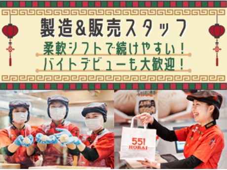 職種/仕事内容 | お仕事内容 551蓬莱 ソトエ新大阪店での販売・製造スタッフ大募集(アルバイト・パート) 店舗に来店されたお客様の接客・販売(商品のご案内やお会計など)のお仕事です。 ◆接客・販売:店舗に来店されたお客様の接客・販売(商品のご案内やお会計など) ◆豚まん製造:豚まんの蒸し・包み、ギョーザの焼き作業、商品梱包 ほとんどのスタッフが未経験からスタートしていますが、難しいお仕事ではありませんし、先輩が丁寧に教えますので安心して勤務いただけます。 全国の方に愛される蓬莱の豚まん。お店には関西の方はもちろん、全国の都道府県や海外からの旅行客さんなど、様々な方がいらっしゃいます。 是非、あなたの笑顔で「551蓬莱」の美味しい豚まんをお客様に届けて下さい! ◆勤務店舗が多数ありますので、自宅から一番近い店舗など他の店舗の紹介も可能です。 |