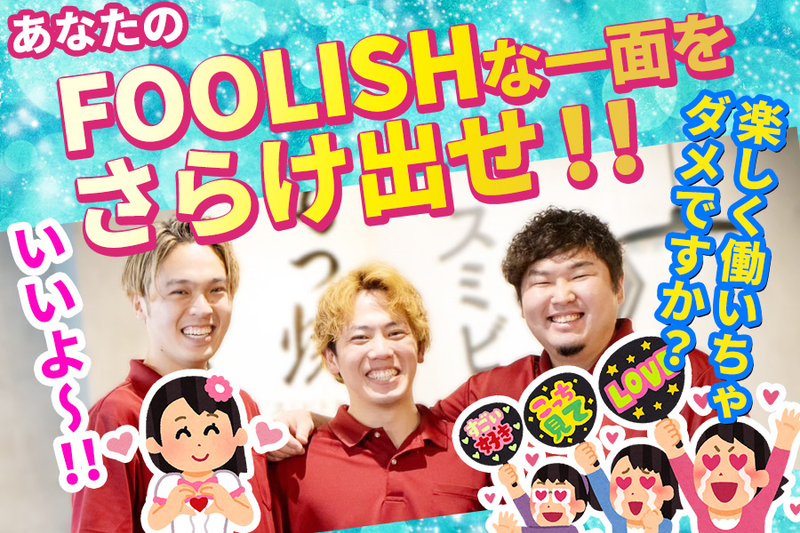 対象となる方 | 求めている人材 【応募資格】 *20歳以上の方(受動喫煙防止のため) ※以下の条件を満たす方<br・日本語能力検定1級保持者 ・就労制限のない在留資格をお持ちの方 (永住者/日本人の配偶者等/永住者の配偶者等/定住者/特別永住者) ⭐人柄・情熱採用⭐ 学歴不問・未経験大募集! 飲食経験がある方は優遇! 即戦力として活躍したい方も必見! 《 ✨こんな方にピッタリ✨ 》 ✋とにかく稼ぎたい人! ✋仲間と青春したい人! ✋バイトの楽しさを社会人でも味わいたい! ✋勢いで人生変えたい人! ✋ベンチャーっぽいノリ、好きな人! 「やってみたい!」って言える あなたなら大歓迎♪ ===求人をご覧の皆さまへ! ✨最終面接担当よりメッセージ✨=== 「笑顔と共に生きる」 ──その想いを、これからの仲間と共に。 私たちFOOLISHは、2017年にスタートしてから、 都内中心に「呼炉凪来(ころなぎらい)」や 「スミビトケムリ」など、流行りのトレンド居酒屋をどんどん出店してます✨ いまや全国で50店舗以上!でもまだまだ満足してません✋ “もっとたくさんの笑顔を届けたい!” ってことで、目指せ70店舗&その先へ! …というわけで、仲間を絶賛募集中⏩ お客様はもちろんのこと、 取引先様、スタッフなど、 私たちに関わるすべての人々に “たくさんの笑顔”を届けるべく、 現状に満足することなく、 さらなる成長・発展を目指しています。 ■人柄・情熱採用! 面接で聞きたいのは、 「なんでウチに来たの?」とか、 「どんな夢ある?」とか、 あなたの“アツい部分”です! 未経験でも安心サポート! ✅安心してスタートできる 研修制度と手厚いサポート体制 ✅スキルを最大限に活かせる ポジション・キャリアステップをご用意 ✅将来的に独立を目指す方に! 独立支援制度でバックアップ(実績あり) ■ FOOLISHの考える仕事とは。 私たちにとって飲食とは、 お客さんに「幸せな時間だったな〜」って思ってもらえる場所。 その裏で、スタッフが笑って、支え合って、楽しんでる。 これぞ、FOOLISHの真骨頂。 お客さんの笑顔はもちろん、 FOOLISHのメンバー全員が “人生楽しんだもん勝ち”って思ってます✋ ■ 未来のFOOLISHを、あなたとともに。 FOOLISHは、 お客様・スタッフ・関係者みんなに 「たくさんの笑顔」を届けるべく ”100店舗出店”を本気で目指してます。 ただの“飲食業”じゃなく、 人生のドラマが生まれる“舞台”をつくるお仕事。 あなたの夢、想い、チャレンジ。 全部歓迎します。 未来のFOOLISHを、あなたと一緒につくっていけたら嬉しいです✨ 年齢の条件と理由:あり(例外事由2号・20歳以上 (受動喫煙防止のため)) |