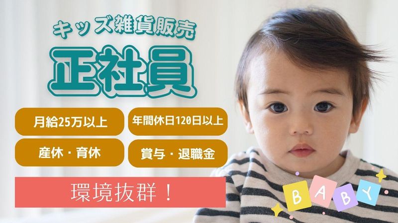 職種/仕事内容 | 仕事内容 \有明ガーデン×Baby Smile/ ==================== ・月10日お休み(毎月希望休あり) ・月給25万円以上~ ・毎年1万円以上の昇給 ・育休/産休 ・私服勤務(お洒落自由) 働きやすい環境です^^ 子供好きな方大歓迎です! ======================== 【お仕事内容】 ・接客販売 ・レジ ・検品、品出し 赤ちゃん、子供用の雑貨販売。 レジはタブレット式の簡単なレジです。 約10品程の商品数の為すぐに覚えられます! 【店長業務】 ・売上管理 ・在庫管理 ・スタッフ育成 ・シフト管理 など店舗運営全般をお願いいたします。 ※店長経験がない方も大歓迎!キャリアアップしたい・チャレンジしてみたいという気持ちがあればOKです。 いきなり店長は不安、という方はスタッフやサブからのスタートも大歓迎! ※1日10名~20名の来店数、スタッフも2名体制の小さなショップの為、店長の負担が少なく高待遇です♪ ※フォロー体制 店舗運営をお任せしますが、エリアをとりまとめる担当営業がしっかりとフォローします! 連絡も常時とれますし、訪問も定期的にするので、店長のプレッシャーもなく相談がいつでもできる安心の環境です。 ======================== *主な取り扱い* ・鼻水吸引機、部品 ・赤ちゃん用スキンケア ・子供用電動歯ブラシ・、歯磨き粉 ・赤ちゃん用肌着 等、小さなお店なので商品数も少なくスローなお店です! 可愛いお子様も沢山来店されます^^ 癒しの空間です。 ゆったりアットホームな空間の為自分のペースで焦る事なく仕事を覚えらるので始めやすい環境です。 店長経験なくても業種問わず接客業の経験あればOK! 気になる方是非ご応募下さい! 大型複合商業施設【有明ガーデン】 湾岸エリア:東京湾岸・有明エリアの中心地に位置。 新しく開放的な施設でお仕事しませんか?? 駅チカ、通勤楽々♪近隣情報 #泉天空の湯有明ガーデン #有明四季劇場 #東京ガーデンシアター #キッズ有明ガーデン #イオン |