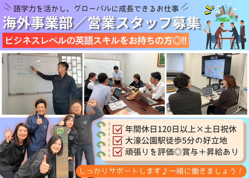 対象となる方 | 求めている人材 ✨営業経験がある方は優遇いたします!✨ 【必須経験✨】 ・営業経験がある方 ・普通自動車第一種運転免許証(AT限定可) ・ビジネスレベルの英語スキルをお持ちの方 【こんな経験があれば歓迎✨】 ・貿易/輸出入に関する実務の経験がある方 ・海外営業/技術輸出に携わっていた経験がある方 ・ビジネスレベルの中国語スキルをお持ちの方 【こんな方に◎】 ・状況に応じて臨機応変に対応できる人 ・海外でビジネスを拡大していく志をお持ちの方 ・自ら道を切り拓き、グローバルに成長したい方 ・日本のノウハウを海外に届けたいという想いがある方 ・少人数チームでの立ち上げフェーズに魅力を感じる方 ・社内外での円滑なコミュニケーションができる方 \\お気軽にご応募ください!// あなたにお会いできる日を楽しみにしています♪ |