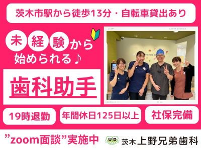 その他 | 【勤務形態】 固定時間制 【期間(備考)】 有期雇用期間あり6ヶ月 【社名(店名・施設名) 】 茨木上野兄弟歯科 【所在地】 大阪府茨木市水尾1-17-1 【事業内容】 ◎歯科 ◎矯正歯科 ◎小児歯科 ◎歯科口腔外科 【ホームページ】 https://ueno-bros-dental-ibaraki.com/ |