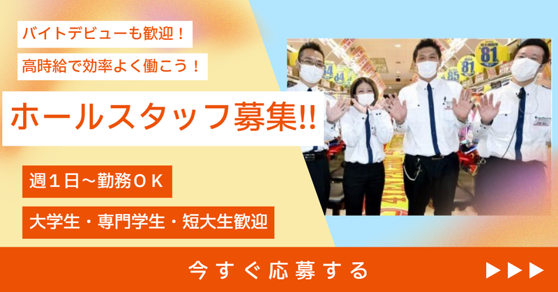 対象となる方 | 求めている人材 ⭐学歴不問 ⭐未経験歓迎! ⭐Wワーカーも活躍中 ⭐大学生・専門学生・短大生大歓迎! ⭐しゅふさん大歓迎! <こんな経験が活かせます!> ・飲食店アルバイトや 居酒屋の経験がある方 ・接客業経験のある方 ・他店のホールスタッフ経験のある方 <こんな方が活躍中!> ・子供を預けている間だけ働きたいしゅふさん ・授業がない日に働きたい大学生さん ・短時間で働きたいWワーカーさん ・お小遣い稼ぎをしたい短大生さん |