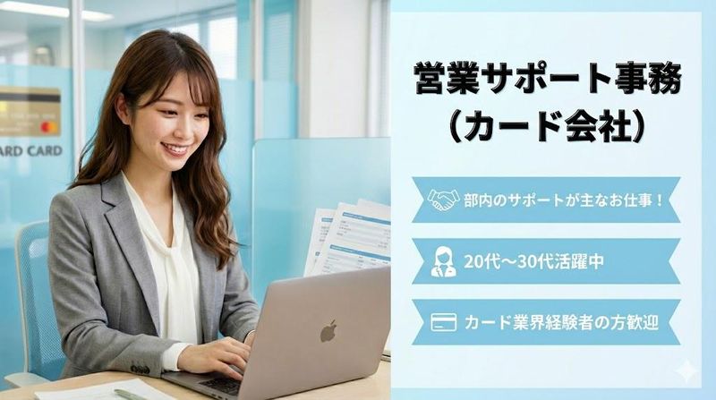職種/仕事内容 | 仕事内容 大手カード会社で、営業事務のボジションです 部内のサポートが主なオシゴト。同じ業務をしている方多めです ・営業担当者からの問い合わせ対応(メール・電話) 不明な点は、すぐに相談できます ・定例レポートの作成、メール配信 マニュアル通りに進めます ・その他 申込書不備チェック、各部署への書類授受、帳票の在庫管理 倉庫への入出庫業務、お客様への書類郵送対応 ・部内のサポート管理 文具、名刺発注、営業本部内の各種ID等の申請業務等 <配属先> ・大手カード会社の部署 <職場環境> ・チームのメンバーは、5名~10名 ・20代~30代の方が活躍中です ・試用期間:なし ・受動喫煙防止措置:屋内全面禁煙 ・業務内容の変更の範囲:なし ・就業場所の変更の範囲:なし ※業務内容・就業場所等の詳細は面談時にお伝えします。 |