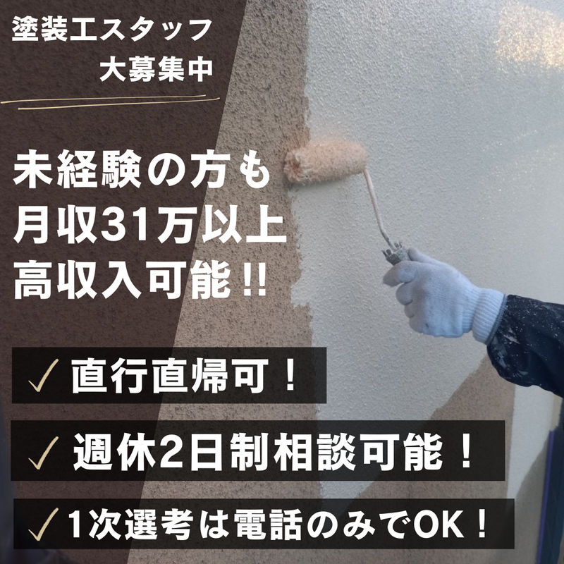 職種/仕事内容 | 仕事内容 -アピールポイント- ☘1次選考は電話のみでOK! ☘未経験の方も手に職つけられます! ☘週休2日制相談可! - <仕事内容> 当社ではビル・公共施設・商業施設・倉庫など 大型な現場から個人住宅・店舗等 小規模な現場の塗装工事や、 新築工事、塗り替え工事、内装、 外装等 様々な塗装工事を行います。 ✨具体的には・・・✨ ☘塗料が付着してはいけない部分を ビニールやテープなどで覆い隠す養生! ☘塗装前の清掃ハケ、ローラーを使って 壁や天井を塗装! ☘一般的なハケ、ローラーを使用した 塗装以外のスプレーガンによる吹付! ☘コテを使った特殊な塗装やパテを使用した 下地処理など! いきなり全てをお任せするわけではありません! 未経験の方はまずは道具を覚えるところから start!塗装作業の補助、準備などから始めて 行き、一人前まで教育して行きますので安心 して下さい。 <1日の流れ(ある日の例)> 08:30|作業開始 10:00|休憩(30分) 10:30|作業再開 12:00|お昼休憩(1時間) 13:00|作業再開 15:00|休憩(30分) 15:30|作業再開 17:30|作業終了・片付け 17:45|定時に退勤!お疲れさまでした! ✨残業は月0~10時間程度✨ ✨しっかりプライベートも充実✨ 現在、職歴2年~20年、20~40代の 見習い・職人さんが活躍しています! 車や飲食やスポーツが好きだったりと 休憩中は趣味の話で盛り上がる事もあります! もちろん、コツコツ働きたい方も喜んで歓迎致します! ★現場によって直行直帰も可能! ★社用車で帰宅するスタッフもいます♪ ★また、車・バイク通勤もokなので 通勤に悩む必要はありません! 安定してしっかり稼ぐことが 出来る環境をご用意しています! ☘弊社が評価されている理由☘ ✅仕上がりの良さをどの現場でも 高く評価いただけているから! ✅元請けの会社さんから重役が いらっしゃった際にも、 「今回の仕上がりいいね!」と 声をかけてくれることが多いんです◎ ✅代表の意向としても柔軟な対応力を 大事にしており、様々な現場からも 「任せて安心!」と信頼いただいてます! |