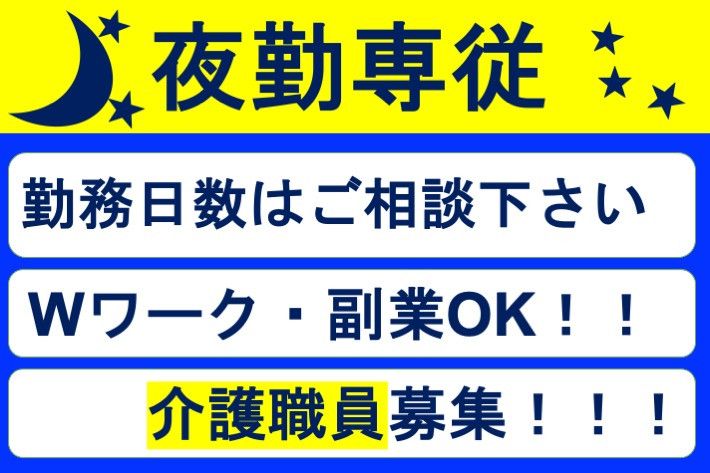 職種/仕事内容 | 【仕事内容】 2025年11月OPEN! ナーシングホームの夜勤専従スタッフ(介護職員)の募集です! ●勤務日数はご相談ください! ■おすすめポイント ●サポート体制充実! 先輩スタッフについてしっかりとした研修や教育制度を整えておりますので、介護施設未経験の方も、ブランクある方も安心してご応募ください。 ●ライフワークバランス 勤務日数などご相談ください! Wワークや副業もOKです! ■具体的なお仕事内容 ・利用者様の巡回と安否確認 ・介護業務と記録 ・起床時の介助やお手洗い誘導 など まずは、「詳しいお話を聞きたい」「会社・事業所・仕事の様子を見学したい」といったご希望もお気軽にご相談ください。 お問い合わせ・ご応募お待ちしております。 |