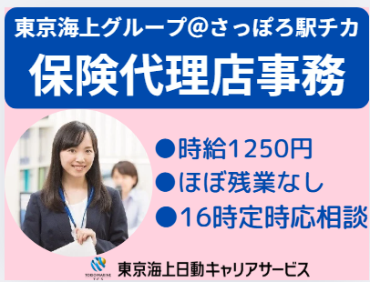職種/仕事内容 | 仕事の内容 \時短勤務も選択OK!オフィスワーク/ ◆16時定時ご相談受付中! ◆東豊線さっぽろ駅よりすぐの好立地! └周囲にはコンビニやランチスポット充実♪ 【基本情報】 雇用形態:派遣社員 雇用期間:長期(3カ月以上) 11月~開始日相談可能 就業時間:9:00~17:00(休憩60分) 【必須条件】 ◆損保事務のご経験がある方 ◆損保募集人資格お持ちの方 └勤務開始までの取得で大丈夫です ◆パソコン:基本操作(入力~修正) 【お仕事内容】 ◆自動車多め!損保事務ワーク ・書類作成~チェック ・計上 ・満期管理 ・電話対応など ◆8名在籍!営業支社内でのご勤務 ・事務ご担当の社員さんが2名います!わからないことは質問、確認をしながらオシゴトできる環境です! 【環境面等】 ・@東豊線 さっぽろ駅/最寄り駅から徒歩1分 ・30代・40代・50代の多い職場 └幅広い年代活躍中/子育てに理解ある主婦(夫)が活躍中 ・駅チカの快適オフィス ・オフィスカジュアル内で服装自由 【福利厚生等】 ・お弁当持参OKです/周辺にはコンビニや飲食店などが充実 ・ベネフィット・ステーション ・社会保険完備 ・定期健康診断あり ・禁煙オフィス!煙苦手な方も安心 ・平日のみOK!土日祝休み ・年間休日120日以上&お休み相談可 └有給休暇 ○●嬉しいPOINTたくさん!●○ 履歴書不要!即日勤務OK・開始日相談/長期/駅チカ/駅歩5分以内/主婦・主夫活躍中/子育てに理解のある職場/ブランクOK/社保完備/残業月5時間以内/17時退社/7時間以内勤務/短時間勤務OK/時間応相談 |