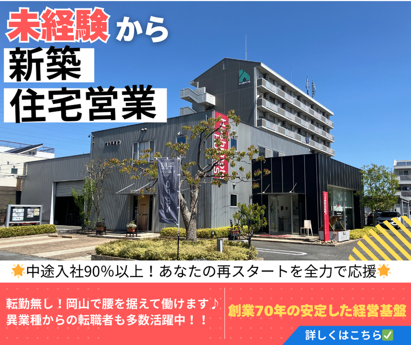 職種/仕事内容 | 仕事内容 ┏──────────────────┓ 経験一切不問! ★反響営業が中心です★ 中途入社の先輩たちが あなたの再スタートを全力で応援します ┗──────────────────┛ \\⭐この求人のポイント⭐//  ̄ ̄ ̄ ̄ ̄ ̄ ̄ ̄ ̄ ̄ ̄ ̄ ̄ ̄ ̄ ̄ ✅未経験OK! └未経験からのスタートが9割以上! ✅ガツガツした飛び込み営業は一切なし └お客様との信頼関係を大切にしています。 ✅充実した研修体制で安心♪ └初めての方も安心して学べるよう、 個別に丁寧にお教えします◎ ✅転勤無し!岡山で腰を据えて働けます♪ ✅創業70年の安定した経営基盤♪ ●○●…………………………………………… お客様の理想の住まいを実現するための 提案とサポートを行います。 ……………………………………………●○● ー ✨具体的な仕事内容✨ ー ⏩お客様案内業務 *モデルハウスにお越しのお客様に、 当社の家づくりへの想いや工夫を わかりやすくお伝えします。 ⏩ヒアリング・提案業務 *お客様の理想の ライフスタイルに寄り添いながら、 最適な住まいのご提案から ご契約までをサポートいたします。 ⏩マーケティング関連業務 *当社の魅力をお客様に伝えるために、 ウェブやSNSでの情報発信、 広告や販促物の企画立案にも 参加いただきます。 ⏩お引渡しまで *建築中の現場へお客様をご案内したり、 各種イベントを企画したりします。 完成までのプロセスを お客様と共に楽しみます。 ⏩アフターフォロー業務 *お引渡し後も、 様々なイベントなどを通じて お客様との関係性を継続していきます。 入社後は経験豊富な先輩社員が マンツーマンで丁寧に指導します。 業界知識や住宅ローンなど、 基礎から学べる 研修制度があるので安心です。 ー ✨一日の業務の流れ(例)✨ ー 09:00 出社・朝礼・清掃 ↓ 09:30 メール確認・お客様へのアポ調整 資料作成・事務処理 ↓ 12:00 昼食休憩 ↓ 13:00 お客様との打合せ ↓ (間取りや仕様など) 15:00 モデルハウス案内 ↓ 17:00 書類作成・事務処理 ↓ 18:00 退社 ー ✨ハシモトホームズについて✨ ー 当社は不動産賃貸管理を基盤とした 安定経営により、 創業から70年を迎えました。 私たちが提供しているのは 自然素材へのこだわりを追求した、 健康的で快適な住まいです。 安全性と安心感、 そして長期的な価値を持つ 美しい家づくりに誇りを持っています。 ハシモトホームズにおける「住まい」とは、 お客様が生涯を過ごし、 ご家族とともに生活を楽しみ、 絆を深め、夫婦の関係を育み、 お子様の成長を見守る場所。 時には仕事や学びの空間となる、 幸せを形にする生活の舞台なのです。 自然素材にこだわった 健康的で快適な住環境、 安全で安心な空間、 そして機能性と先進性、 普遍的価値を兼ね備えた 美しく価値ある「住まい」と その周辺環境をお届けします。 美しい住まいづくりを通して お客様に豊かで幸福な人生を 実現していただきたいと願っています。 当社の本業である美しい 住まいづくりの仕事は、 「お客様とご家族に大きな 幸せをもたらすことができる 素晴らしい仕事である」と 自負しています。 美しく質の高い住まいを提供し、 住生活の価値を高め、 美しい街並みを創り出すことで、 地域の住文化向上に貢献する事業を 継続していきます。 |