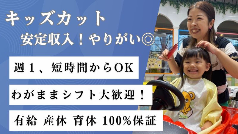 職種/仕事内容 | 仕事内容 【チョッキンズって?】 0歳~小学生までの こども専門美容室です。 カット中心。 シャンプーは短時間。 手荒れの心配なし。 - 【こんな仕事です】 ありがとうが溢れる仕事。 親御さんの感謝が力になる。 子どもの素直なリアクション。 癒しと笑顔をもらえる毎日。 喜びの瞬間がやりがいに。 心が動く感動の連続です。 家族の思い出をつくれる。 大切な瞬間を残せる場所。 - 【ママ美容師の平日勤務イメージ】 9:30 出勤・準備スタート 店内を整えて気持ちよく開始☆ 10:00 午前カット開始! ファーストカットがいっぱい。 メモリアルの感動に笑顔♪ 12:30 ランチでリフレッシュ お弁当も外食も自由自在。 動画視聴も買い物も楽しめる。 モール内だから充実休憩◎ 13:30 午後カットスタート 幼保・学校帰りでにぎやか♪ 兄弟や親子での来店も多数。 16:00 時短勤務で退勤 我が子のお迎えも余裕あり! 夕食準備も安心してできる。 |
