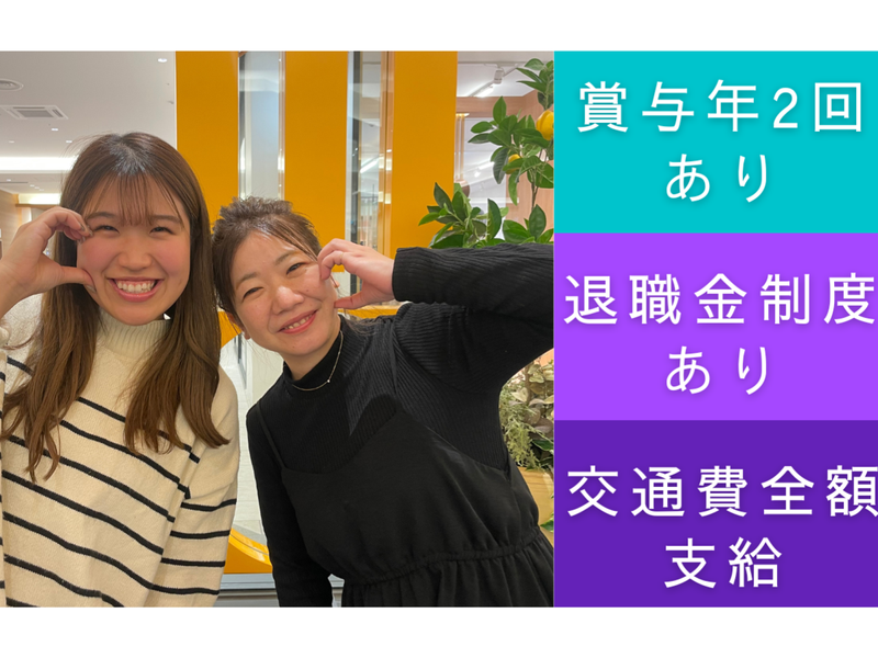 待遇・福利厚生 | 【保険制度】 雇用保険、労災保険、健康保険、厚生年金 【福利厚生】 待遇・福利厚生 【福利厚生】 ▶各種社会保険完備(雇用・労災・健康・厚生年金) ▶昇給あり(毎年1万円以上の昇給) ▶実績賞与年2回(7月・1月)※約2ヵ月分支給 ▶各種社会保険完備 ▶交通費全額支給 ▶健康診断(年1回)婦人科健診付き ▶時間外手当(超過分) ▶髪色・髪型・ネイル自由 ▶退職金制度 ▶インセンティブ制度導入(1月~) |