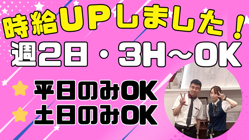 勤務時間 | シフト制 勤務時間詳細 16:00~24:00 ⭐週2日~・1日3時間~OK♫ ⭐シフトは2週間ごとの自由自己申告✨ ⭐固定シフトも可能! ⭐平日のみor土日のみもOK! |