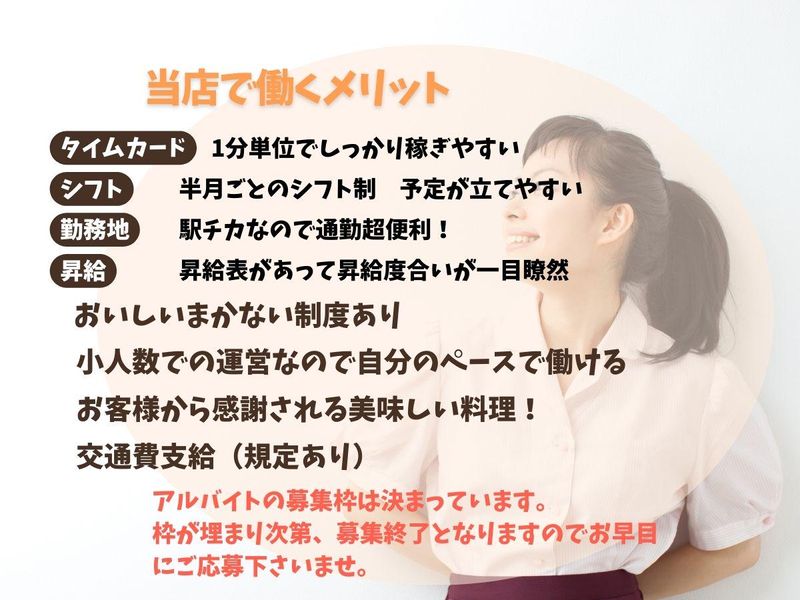 給与 | 時給1,180円~1,450円 給与詳細 基本給:時給 1180円 〜 1450円 ・交通費支給 ・おいしい賄いあり(規定あり) 【給与例】 給与例 \月収例/ 94,400円 *週4日勤務の主婦さん 時給1180円×5h×16日 =月収94,400円 |