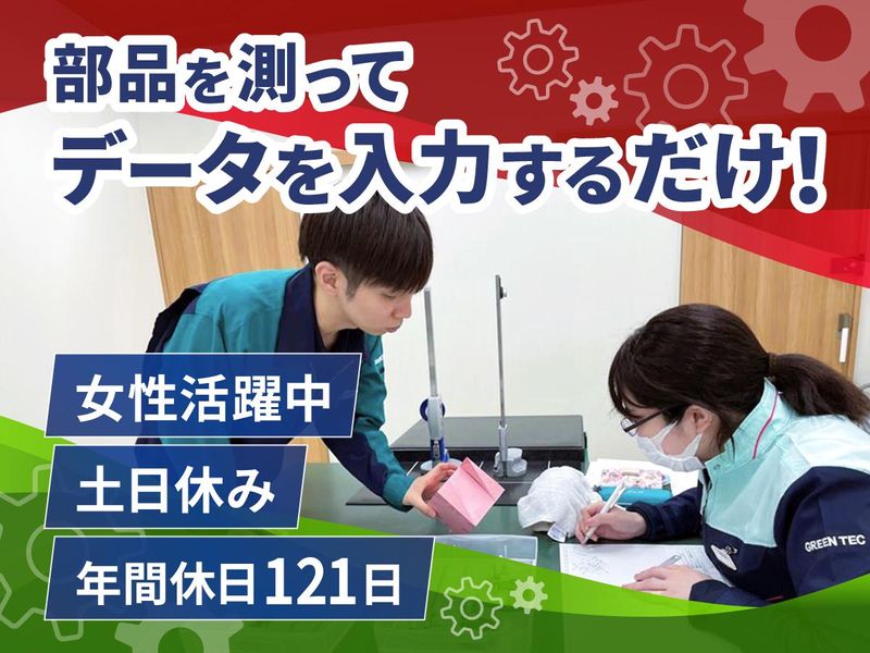 職種/仕事内容 | 仕事内容 自動車部品等の検査・データ入力などの測定事務。 座り仕事でパソコン入力も多いです。 <具体的には…> 専用の測定機器を使って、自動車部品のサイズをはかり、 パソコンに数値を入力します。 業績好調のため請負案件増加!人員拡大中! 【おすすめポイント!】 (1)充実の研修!技能育成センターという専用施設にて10~20日の研修を行います! (2)資格取得支援もサポート! (3)スキルアップ・キャリアアップも可能! (4)年間休日121日&日勤のみ&完全週休二日制! (5)テーマパーク補助券など、福利厚生充実! ◆手厚い教育体制 <入社当日>まずは測定の入社後教育からスタート!入社オリエンテーション、安全教育 <入社2日目~センター研修まで> ①入社後、技能育成センターにて10~20日の研修を受けます! ?プロジェクトの進捗管理、他部署・協力会社への手配・発注なども含めて、基本的な知識や技術を学びます! ②現場配属後は、「はかる」「パソコン入力」など簡単な作業からスタート! ?基礎を覚えたら、測定結果から異常値の検出やその傾向を見る「分析」などへステップUP!機械検査2級以上(国家資格)の取得をはじめ、測定の手順書の作成など、測定のプロを目指します! ◆スキルアップも応援 個人のスキルを正当に評価し給与に反映させるため、毎年スキル評価を実施。 資格取得や、扱う測定器の種類が増えることで、給料や賞与UPも狙えます。 ◆キャリアアップも応援 マネジメントを中心とする、所長やマネージャー営業に進む道もあれば、測定を究め「指導員」といった技術を教える側に進むことも可能です。 |