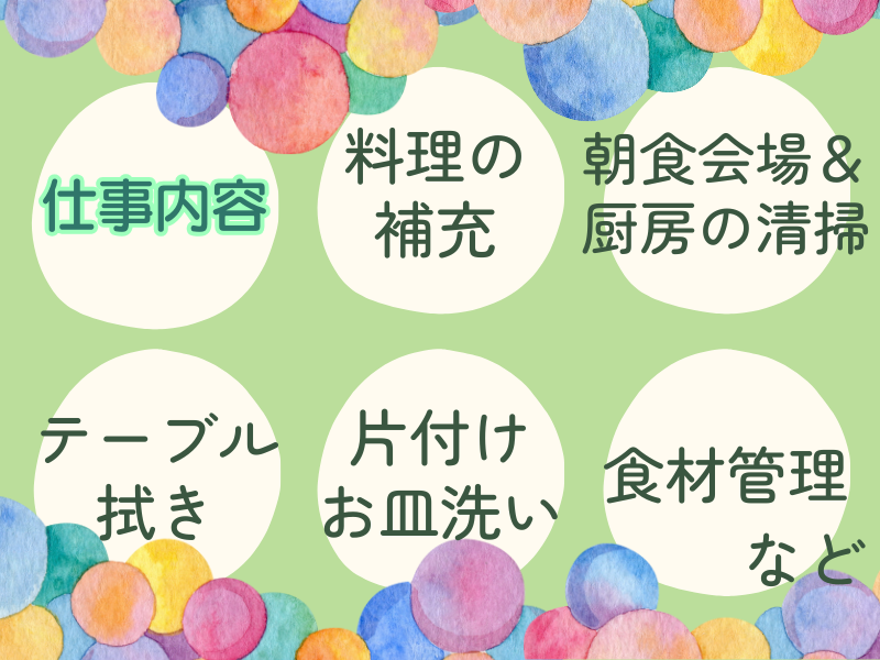 職種/仕事内容 | 仕事内容 **――**求人POINT!**――** ✅ 週3日~勤務OK ✅ 未経験・ブランクOK♪ ✅ 早朝手当あり ✅ 配膳・会計業務なし! ✅ 最寄駅から徒歩1分で通勤便利◎ ✅ 扶養内勤務可 ――**――**――**――**―― 東横INN京都四条大宮にて、 朝食の準備・片付けなどをお任せします。 調理経験や資格は一切不要です♪ 【具体的なお仕事】 ・朝食メニューの温め・盛り付け ・料理の補充 ・食器の片付け・洗浄 ・テーブルや会場内の清掃 ・発注や納品確認 など お客様が好きなものを自分で取るビュッフェ形式。 まずはお客様に明るく挨拶をお願いいたします。 落ち着いた環境で、朝の時間を 気持ちよく使えます。 ⭐午前だけで働きたい方に!  ̄ ̄ ̄ ̄ ̄ ̄ ̄ ̄ ̄ ̄ ̄ ̄ ̄ ̄ ̄ 「朝だけのパート」を探している方にぴったり。 シフトは5:30〜9:30の4時間で 週3日〜勤務OK! 週5日働いていただける方は大歓迎です♪ 午後からは自由に時間が使えるので、 買い物・通院・家事の予定も立てやすく、 家族との時間も大切にできます。 ⭐駅チカで通勤便利♪  ̄ ̄ ̄ ̄ ̄ ̄ ̄ ̄ ̄ ̄ ̄ ̄ ̄ ̄ ̄ 阪急京都線大宮駅から徒歩1分、 京福電鉄嵐山線四条大宮駅から徒歩1分! 雨の日でも濡れる心配が少なく、 ストレスフリーで通えます。 通勤時間を短縮したい方にぴったりの職場です。 【応募方法】 ✨直接採用担当とお話ししたい方 →電話での応募大歓迎! 075-803-1045 までお気軽にお問い合わせください! ✨【応募】ボタンから応募の方 →エントリー後、担当者からご連絡差し上げます。 ご連絡が取れる 電話番号またはメールアドレスの 記載をお願いします。 |