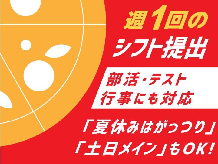職種/仕事内容 | 仕事内容 /////////////////////////////////////// バイト、始めるならピザーラで!! /////////////////////////////////////// ピザーラはシフトの自由度が高いから・・・ ▼こんな働き方だって可能です!▼ ○休み前のテスト期間はシフト少なめ ○長期休みはたっぷりシフトに入って ○ライブとか友達との約束の日はお休み ○新学期になったら働く日数や曜日を変えたい ・・・も全部大丈夫!だから、 学生さん・副業・Wワークも大歓迎! 初めてのアルバイト先を探している方にもおすすめです! ほかにも、 ○バイク初心者さんOK ○清潔感があれば髪型髪色も自由 ○3時間~の短時間勤務OK など、新しいシゴトにチャレンジしたい方を応援するフォロー体制抜群の環境です! ー <ピザの配送ドライバーの仕事> お客様宅へ、ピザーラのピザをお届けする仕事です。配達エリアは牛久市内がメイン。土地勘が無くても、出発前に地図をチェックして行けるので安全に配達が可能!ルートについては先輩が丁寧にアドバイスします! ○分以内に!・・・なんて時間のノルマなどもないので安心して配達できますよ! ー <普通免許さえあれば大丈夫> 普通免許は持っているけど、原付バイクは乗ったことがない・・・教習所以来乗っていない・・・そんな方も大丈夫です! 最初はお店の周りや交通量が少ないところで運転の練習から始めます。 操作も簡単なので、お久しぶりの運転でも、初めての運転でも、1日~2日程度で配達に出れるくらいのスキルが身に付きます!今活躍しているスタッフも、「バイクなんて乗ったことない!」という方がほとんどでした。不安な点もしっかりフォローしていきますのでご安心下さい。 注文が入ったら、先輩スタッフの後ろをついていきながら2名で配達に出かけます。一通りの仕事の流れを確認して、1人でも大丈夫、となったら1人配達デビューしていただきますね! ー <仕事はシンプル!> お会計は注文時にクレジットや電子マネー決済で、というお客様も多いので、現金の受け渡しは少なめです。運転していて外の空気に触れる時間も長いので、日頃、メインのお仕事でPC業務が多い方、勉強や部活に忙しい学生さんなどからは、働きながらリフレッシュできる、なんて声もあります。お客様から直接「ありがとう」と言われるのもやっぱり嬉しいですよ! シフトは週1単位で作成していますので、予定に合わせて勤務日数を決められて便利!旅行の為に収入を増やしたい!そんな方にもおススメです!まずは、週末2日間だけ、慣れてきたら平日も・・・など細かい調整もご相談ください。 ー <嬉しい従業員割引> ピザ・パエリアなど半額で購入可能です!友人や家族とのイベントにもピッタリ!! ー |