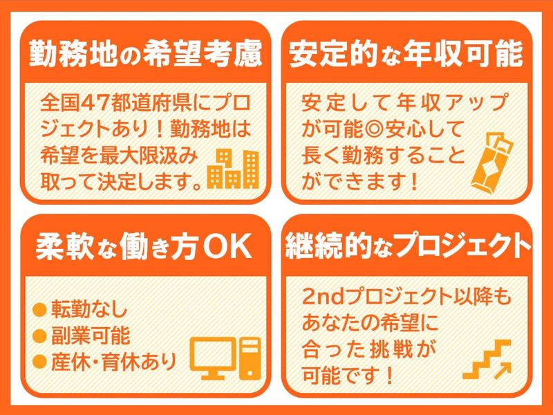 待遇・福利厚生 | 【保険制度】 雇用保険、労災保険、健康保険、厚生年金 【福利厚生】 待遇・福利厚生 【福利厚生】 【社会保険】 健康保険、厚生年金保険、雇用保険、労災保険 【福利厚生】 〇昇給年1回 〇四半期一時金*年間40万円(10万/四半期×4)支給条件有 〇プロジェクト賞与 〇確定拠出年金制度 月額給与の6%相当額を確定拠出年金(401K)の掛金として拠出 〇再配属報奨金※支給条件有 〇永年勤続報奨金 〇出産祝い金 〇結婚祝い金 〇単身赴任手当 〇引越準備金(会社都合により引越が発生する場合に支給) 〇社用車貸与(駐車場・有料道路・ガソリン代支給) 〇研修制度(導入研修、各種研修、E-learningなど) 〇副業OK(業務に支障のない範囲で認めています) *多様な働き方も応援! 可能な範囲で副業を認めています。 |