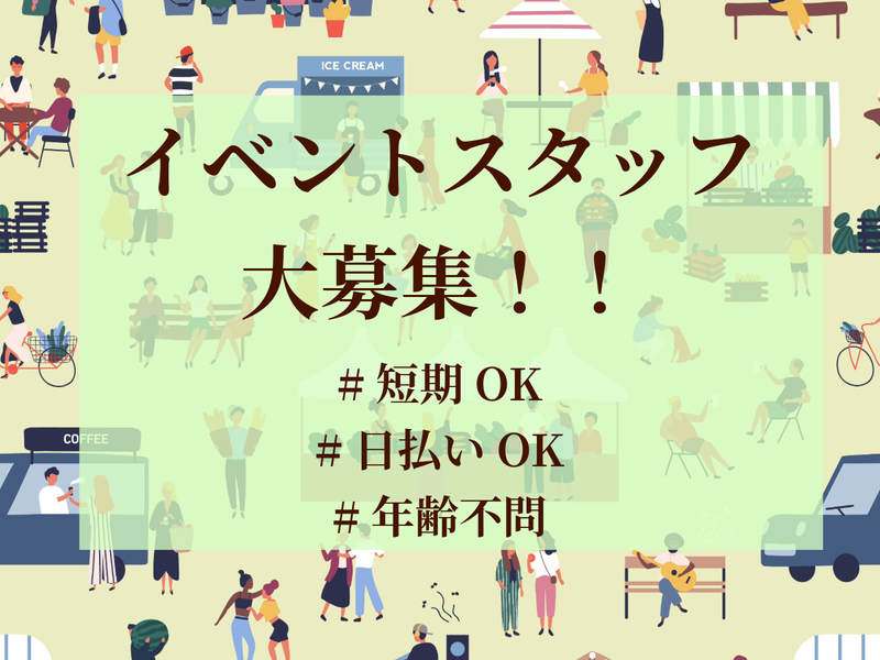 勤務時間 | シフト制 勤務時間 平均所定労働時間:8時間/日 日勤/8時~17時(実働8h) ※イベントの特性上、時間変更・延長の可能性有 短期1日,月1日~,週1日~などシフト自由・相談OK 土日祝(週末)のみOK 平日のみOK 残業なし 就労期間:短期OK 長期も大歓迎 |