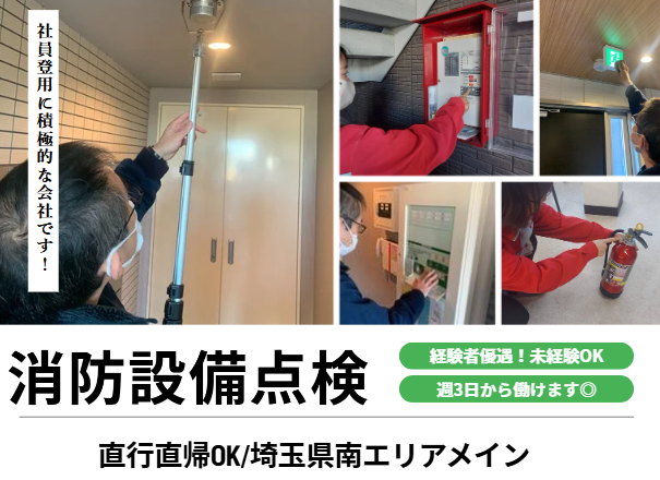 職種/仕事内容 | 仕事内容 ✦・┈┈┈┈┈ ・✦✦・┈┈┈┈┈ ・✦ 安定性バツグンの “消防設備点検”で長く働く! 社員登用に積極的な会社です◎ ✦・┈┈┈┈┈ ・✦✦・┈┈┈┈┈ ・✦ <⭐ここがポイント⭐>  ̄ ̄ ̄ ̄ ̄ ̄ ̄ ̄ ̄ ̄ ̄ ̄ ̄ ̄ ̄ ̄ ̄ ̄ ✔ 未経験者歓迎 ✔ スキルに応じて責任者スタートも可 ✔ 社員登用を積極実施(実績多数) ✔ 法律で義務化された安定職種 ✔ チーム作業で安心 ✔ 資格取得支援あり(費用補助あり) ✔ 30〜50代が多数活躍中 ╭━━━━━━━━━━━━╮ お仕事内容を紹介します! ╰━v━━━━━━━━━━╯ マンション・アパート・オフィス・ 商業施設などを対象に、 2名以上のチームで 消防設備の点検を行う仕事です! 法律で義務化された点検のため、 景気に左右されず安定◎ 経験者にはすぐに現場を お任せできる環境が整っています! ╭━━━━━━━━━━━━╮ 具体的には…? ╰━v━━━━━━━━━━╯ ✅消火器点検 ✅避難器具の点検 ✅誘導灯・火災報知器設備の点検 など 先輩スタッフと一緒に現場を回り、 丁寧にお教えしますので、 未経験でも安心してスタートできます。 経験者の方は即戦力として優遇! 現場は30~50代のスタッフが中心で、 年齢が近いメンバーが多く 落ち着いた雰囲気です。 ガヤガヤした感じではなく、 作業しつつ必要なところで声を掛け合う、 ちょうどいい距離感の職場◎ チームで動くので、わからないことがあれば すぐ相談できる環境ですし、 経験者の方は「任せてもらえる」 安心感があります♪ - ⭐未経験大歓迎!安心のフォロー体制 - 最初は必ず先輩と同行。 作業の流れや点検項目を 現場で丁寧に指導します。 ✔ 簡単道具の扱いから教えていきます! ✔ 最初は補助作業のみ ✔ チーム体制なので1人になることなし! - ⭐経験者のキャリアアップも支援 - 消防設備点検の経験を活かして、 正社員を目指したい方も大歓迎。 点検票などの事務作業も習得でき、 スキルの幅が広がります。 ** あなたの技術を 必要としている現場があります! 無理のない働き方で、”未経験から…” ”経験者だからこそ”できる 働き方を始めませんか? |