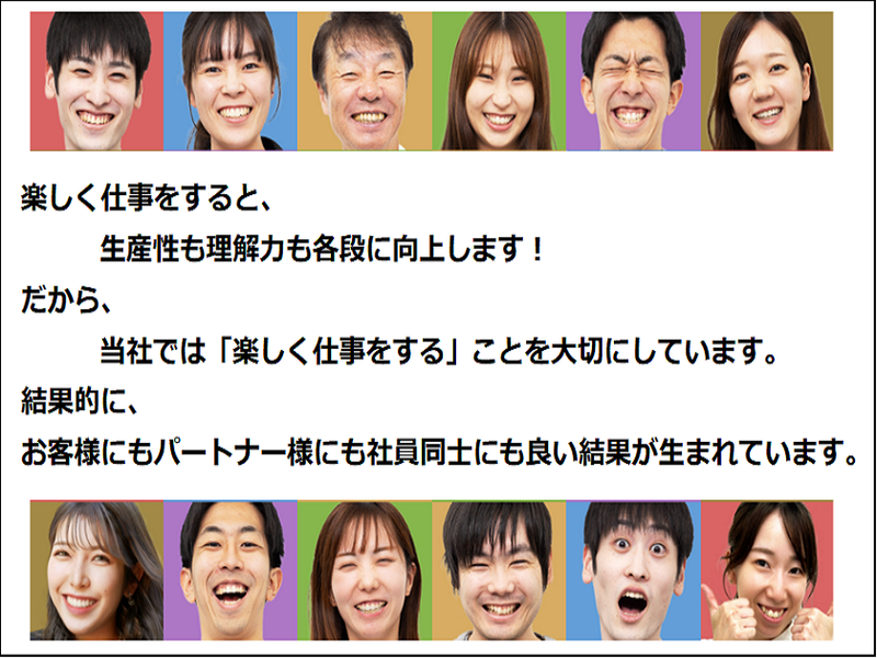 職場環境・雰囲気 | 職場環境 ⭐思いやりを大切にする人たちが集結 弊社と繋がる出来るだけ多くの人が、 「笑顔でいられる状態」を作り、 維持することを大切にしてます。 喫煙所:なし(敷地内全て禁煙) |