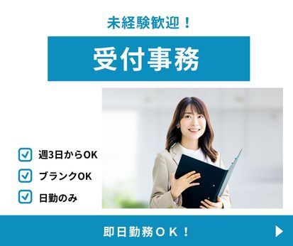 職種/仕事内容 | 仕事内容 週3~勤務OK(土日祝含む) 受付業務、一般事務、電話対応、来客対応など 無料送迎バスあり <こんな方の応募が多数です> (1)「次のお仕事が決まるまでのつなぎに◎ 即日勤務OK!すぐに働けます」 (2) 「ブランク期間をつくらず収入確保!転職活動と両立できるお仕事」 (3) 「スグ働ける!日払い・週払いOK◎ 転職準備中の収入も安心」 「転職活動中も収入をキープ!スキマ時間で働ける柔軟シフト◎」 「正社員へのステップにも◎ 経験不問&即日スタートで新しい一歩を!」 他にも主婦(夫)・パートさんも活躍しています 【いつでもどこでも登録OK★】 ◆登録時【履歴書不要】【来社不要】 ◆当社HPから、365日/24hいつでもWEB登録可能♪ <Q&A>入社までの流れについて Q. 応募してからどれくらいで働けますか? A. 応募から入社までは、1週間~通常2週間以内の現場が多くなっています。 Q. 急いで仕事を始めたいのですが対応してもらえますか? A. 即日面談やスピード対応が可能な案件もご案内可能! ご希望をお伺いして、最短で就業できるお仕事をご紹介いたします。 Q. 他の仕事と比較してから決めたいのですが、相談だけでも可能ですか? A. もちろん可能です。 複数の選択肢をご提示しながらご案内します! <Q&A>収入について 【お給料の支払いについて】 Q. 日払いは対応していますか? A. はい、日払いに対応しています。 前日の11時までに申請⇒当日の夕方までにお給料をお受け取りいただけます。 Q. 夜勤の場合でも日払いは可能ですか? A. はい、夜勤後も対応可能です。 お仕事終了後、朝11時までに申請⇒その日のうちにお給料をお受け取りいただけます。 Q. 前払い制度はありますか? A. ご利用可能です。 詳細は勤務先や就業形態によって異なりますので、ご相談時にご希望をお伝えください。 Q. 申請方法は難しいですか? A.どなたでもスムーズにご利用いただけます。 スマートフォンやPCからの申請も可能です! |