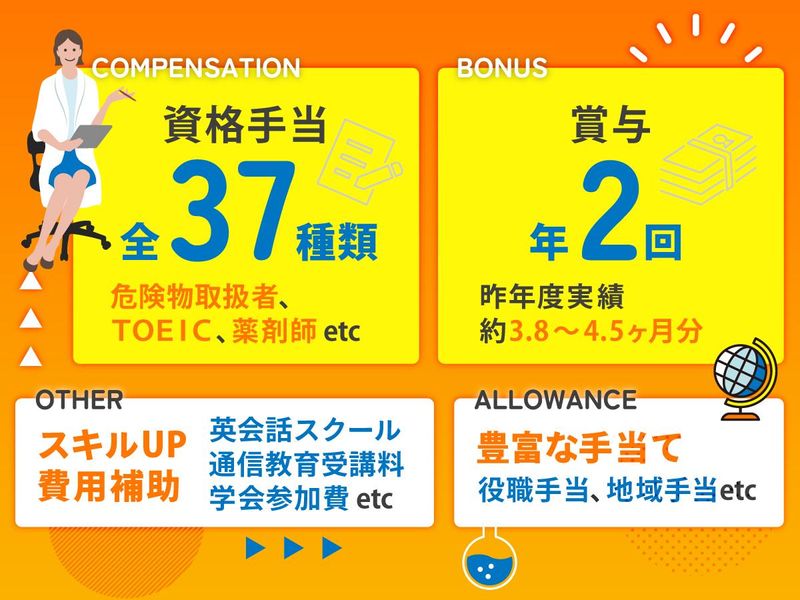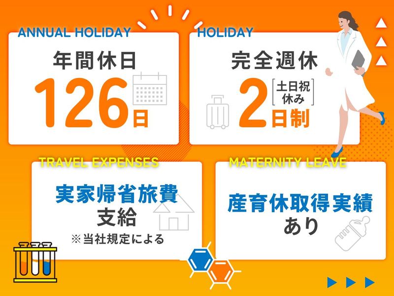 職場環境・雰囲気 | 職場環境 『メンバー間のフォロー体制』『社員同士で交流を深められるエリア会』『配属先ごとに営業担当のサポート』…など、もし困ったことがあっても、すぐに相談できる環境が整っています。未経験から入社した先輩も多数活躍中!研究者として新たな一歩を踏み出しませんか? 喫煙所:なし(敷地内全て禁煙) |