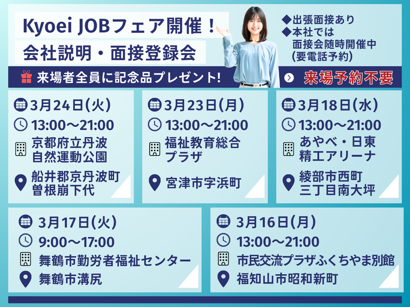 職種/仕事内容 | 仕事内容 ✦• • · ·━━━━━━━━━━✧ ベルト製造・検査スタッフ 大募集◎ ✧━━━━━━━━━━· · • •✦ 【仕事内容】 ・成形工程・仕上げ工程(研磨、カット、検尺)での作業 ※家電用の小さなベルトから、自動車用エンジンベルトまで ・検査済み商品の梱包・出荷作業 具体的には... ベルトの材料となる各部材(歯布、心線、ゴムなど)を 金型に巻き付けてベルトの原型を作り、 筒状のベルトを形成→研磨→出荷までの工程を 行っていただきます! 家電等の小さいベルトから、 自動車等のエンジンベルトのように長いものまであります。 ※立ち仕事になります \オススメポイント/ ◆年間休日数127日+入社6ヶ月間限定の特別休暇3日間あり ◆産休・育休(取得実績有) ◆各種社会保険完備 ◆通勤交通費規定支給 (車、電車通勤可 ※バイク通勤不可) ◆永年勤続社員表彰制度有 ╭────── · · ୨୧ · · ──────╮ 協栄設備サービス株式会社 会社説明&面接登録会 定期開催中! ╰────── · · ୨୧ · · ──────╯ *˖*✧*協栄設備サービスの強み*˖✧*˖ ・経験や希望に合わせた仕事探しをサポート ・就業後のキャリアアップやお悩み相談も完全バックアップ ・地域密着で地元企業とのつながり多数 ・定年まで安定して働ける環境 ・休日・休暇が取りやすい \\ // // 協栄設備サービス株式会社 会社説明&面接登録会 定期開催中!! // // \\ 【2026年3月スケジュール】 ◆3/16(月)13:00~21:00 市民交流プラザふくちやま別館 第2会議室 福知山市昭和新町105 ◆3/17(火)13:00~21:00 あやべ・日東精工アリーナ 会議室2 綾部市西町三丁目南大坪39番地10 ◆3/18(水)13:00~21:00 舞鶴市勤労者福祉センター2F 洋室1 舞鶴市溝尻150-11 ◆3/23(月) 13:00~21:00 福祉教育総合プラザ 第3コミュニティルーム 宮津市字浜町3012番地(ミップル3F) ◆3/24(火)13:00~21:00 京都府立丹波自然運動公園 トレーニングセンター研修室 船井郡京丹波町曽根崩下代110番地7 ※予約不要お気軽にご来場ください ・来場者全員に記念品をプレゼント! ・当日ご都合の悪い方は出張面接致します ・本社にて面接会随時開催中(要電話予約) |