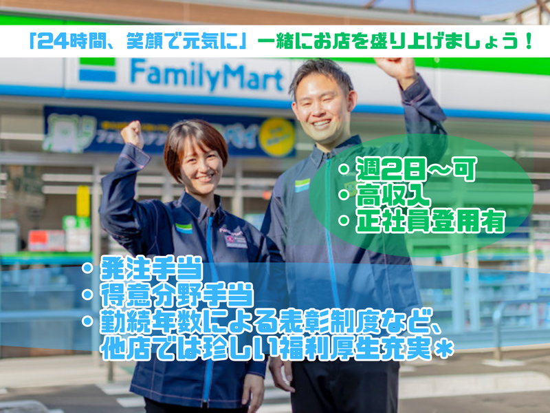 対象となる方 | 求めている人材 ・経験不問:未経験OK ・バイトデビューOK ・WワークOK ・ブランクOK <✨こんな方にオススメ✨> ✅夜勤でガッツリ稼ぎたい方 ✅近隣で通勤負担なく働きたい方 ✅本部仕込みの接客を学んでみたい ✅アルバイトから正社員を目指したい <✨活かせる経験✨> ※必須ではありません ◎飲食店・居酒屋や販売などの接客経験 ◎スーパーなどでの品出し・陳列 など =============== ステップアップも応援! =============== やる気次第で正社員登用や店長へのステップアップも可能。 店長はファミリーマート本部での勤務経験があり、 しっかり必要なことをお教えします! 将来的に役職に就きたい方や独立したい方へは 経験商品にあわせて商品発注や店舗運営も少しずつお任せします。 「スキルを活かせる環境で働きたい」 「経験をもとにステップアップしたい」 そんな方も大歓迎! 良いお店作りを学びながら、あなたらしく成長しませんか。 =============== 出来ることが増えれば収入UP =============== 身に付いたスキル等に応じて、収入としても還元していきます。 発注を担うようになったら「発注手当」、 「得意分野手当」や、勤続年数によっての表彰制度もご用意。 コンビニでは珍しい手当で収入UPにも繋がります! 少しでも長く一緒に働いてもらえるように収入面でも不安のないような環境つくりをこれからも行っていきます。 - 他にも、夢や目標がある人も応援! どんな目標でも構いません♪ 大きな目標があるわけではないという方ももちろんOKですので、 肩の力を抜いて気軽にご応募ください。 - 固定シフトの中、スタッフ同士でシフト交換等の調整もできる環境です。 |